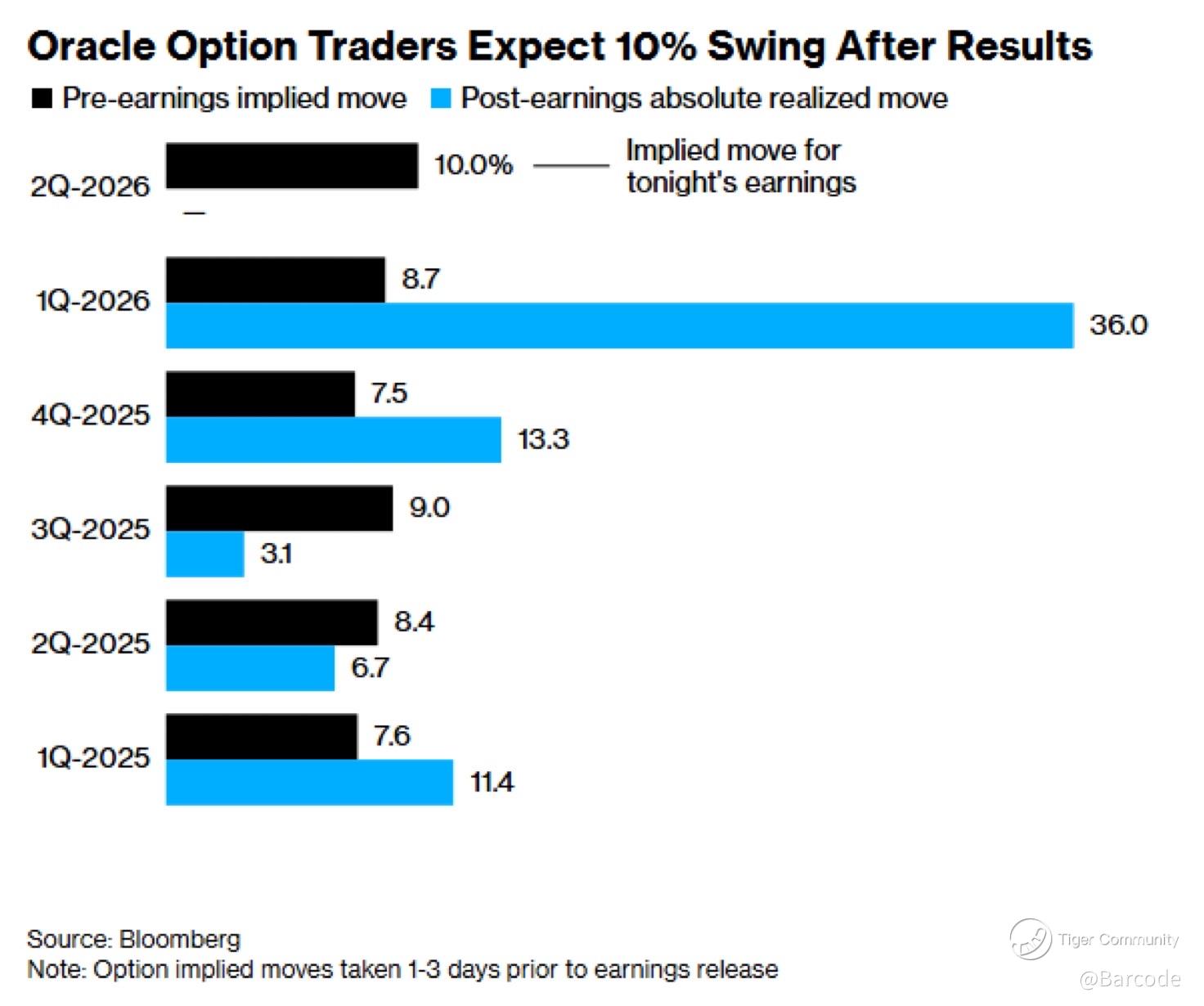 Iβm convinced Oracle is entering tonightβs earnings with the most asymmetric risk reward in global tech. The share price has fallen roughly 33 % from the highs near $330 to $220.75 on your chart, completely retracing the 20 % September earnings surge that briefly added $200B in market cap. Now traders are positioned for a violent event. The ATM IV term structure shows near expiry implied volatility above 140 % with a projected swing close to 10 %. This is where a half trillion dollars in AI cloud backlog commitments must be proven real and monetisable, not just headline potential.