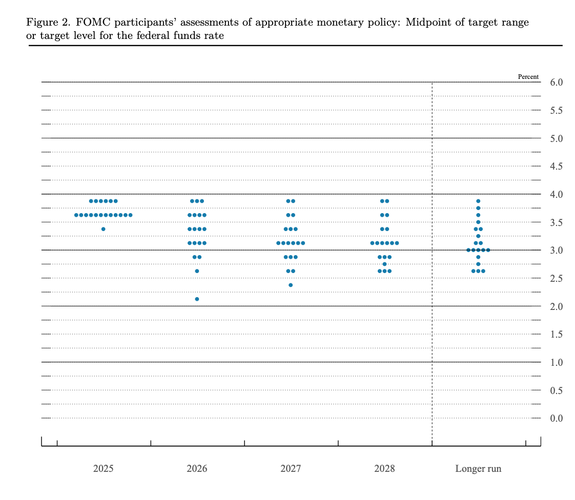 Powell’s term ends in May 2026, and upcoming meetings—as well as potential personnel changes—will test policy continuity. While the dot plot shows relatively stable long-term projections (long-run rate around 3.0% for 2026–2028), the short-term path remains highly uncertain