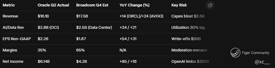 Q2's $16.1 billion revenue (up 14% YoY) edged est, with net income exploding to $6.14 billion ($2.14/share, up 95%), but the capex spike to $2.5 billion (up 19%) on Stargate expansions fueled fears of $50B write-offs if utilization sticks at 30%. OCI's 34% leap to $2.8 billion and AI deals tripling hint $10B run rate by 2027, but backlog delays from OpenAI's limbo crimp growth to 12% vs est 15%, tanking shares 12% and CDS to 140bps. This miss echoes MSFT's quota cuts, amplifying chain-wide doubts β but AVGO's Q4 could counter with AI rev doubling on TPU synergies, stabilizing sentiment if $17.5 billion rev lands.