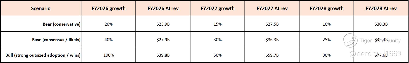 If FY2026 growth = 40% → FY2028 ≈ $45B (base)