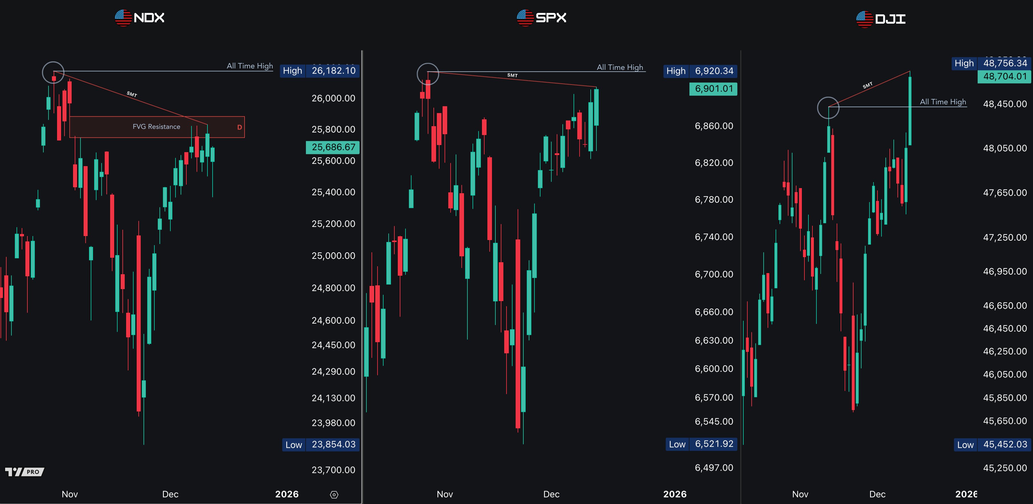 We’ve got a bearish SMT divergence at all-time highs: $Dow Jones(.DJI)$ just printed a new high while $S&P 500(.SPX)$ and $NASDAQ 100(NDX)$ did not.