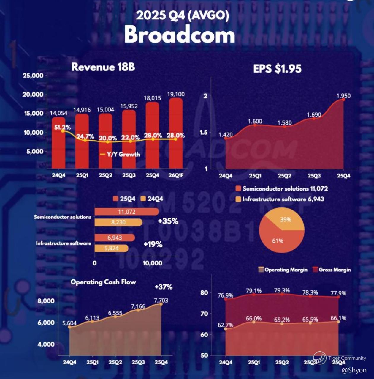 Broadcom's latest earnings clearly show that the company is executing well operationally. Adjusted EPS of $1.95 and revenue of $18.02 billion for fiscal Q4 beat analyst expectations, and year-over-year growth of 37% in earnings and 28% in sales is impressive. AI semiconductor sales, which jumped 74% YoY, were a major contributor, and the guidance for Q1 revenue of $19.1 billion — up 28% YoY — underscores that Broadcom continues to ride strong demand in the AI and data center markets. On paper, this is a robust performance.