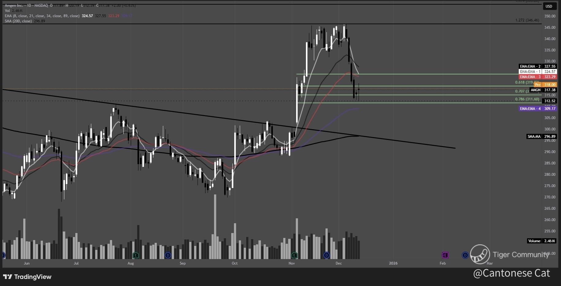 $AMGN into strong retracement zone, three drives lower and it took the range low yesterday (11/6 low) and found buyers note the long leg doji