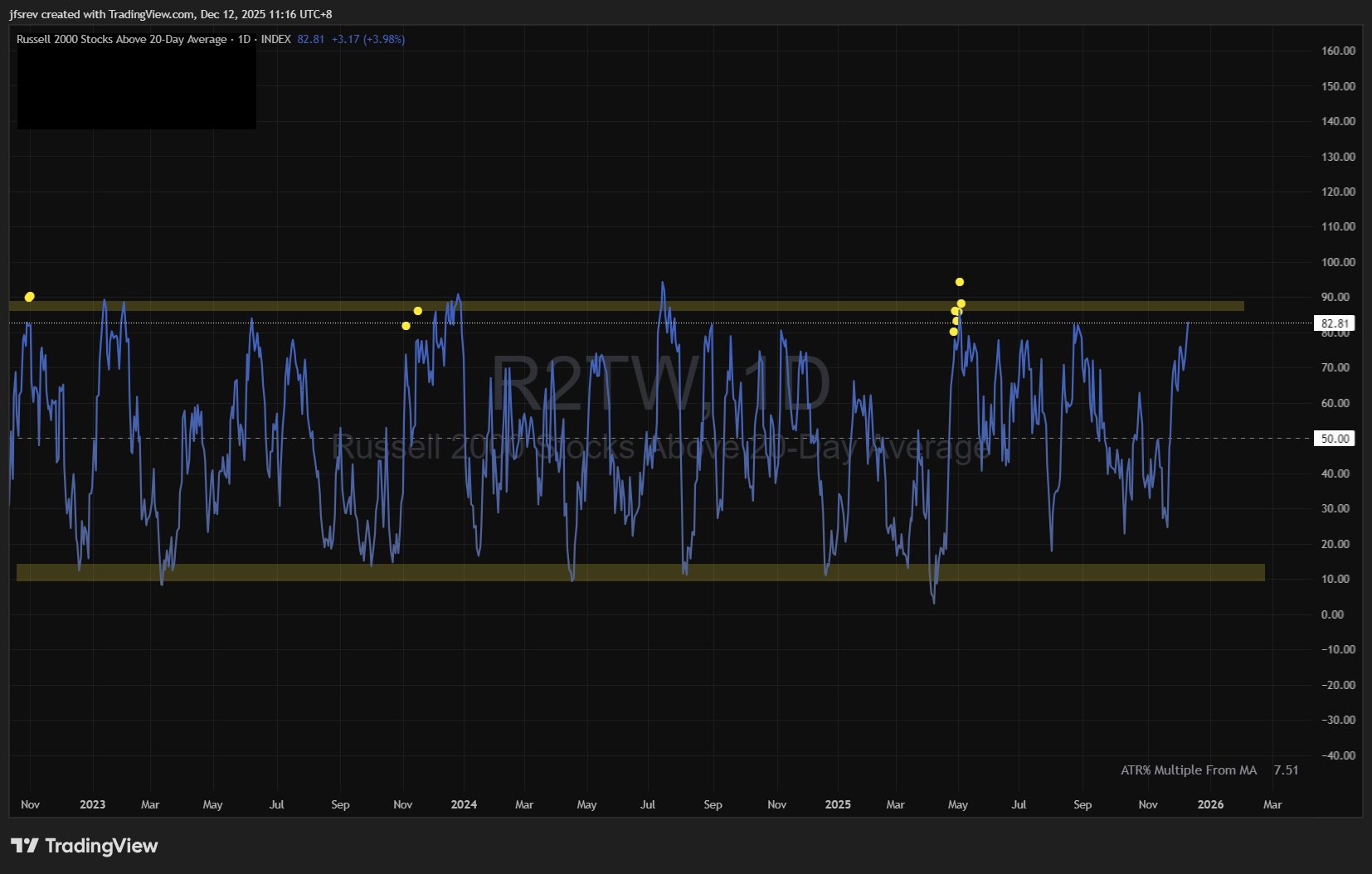 R2TW is now pushing above the 80% mark, which sits within the historical correction zone (80–90%).