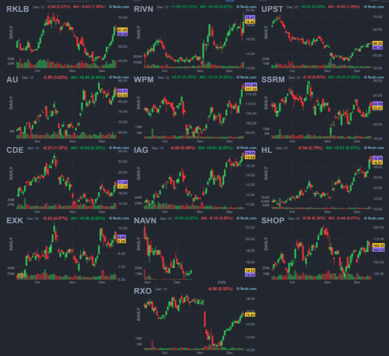 $Rocket Lab USA, Inc.(RKLB)$ $Rivian Automotive, Inc.(RIVN)$ $Upstart Holdings, Inc.(UPST)$ $Anglogold Ashanti(AU)$ $Wheaton Precious Metals(WPM)$ $SSR Mining Inc(SSRM)$ $Coeur Mining(CDE)$ $Iamgold(IAG)$ $Hecla Mining(HL)$ $Endeavour Silver(EXK)$ $Navan, Inc.(NAVN)$ $Shopify(SHOP)$ $RXO INC(RXO)$