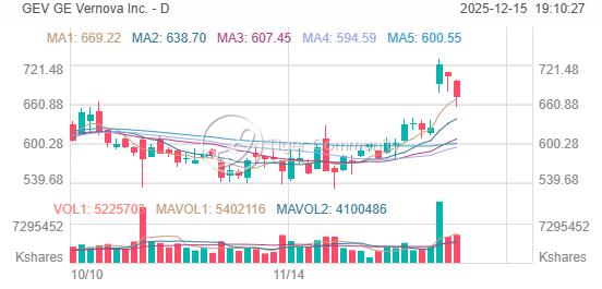 GE Vernova closed at $671.71 on Dec 15, down -4.61% (-$32.49) from previous close of $704.20.