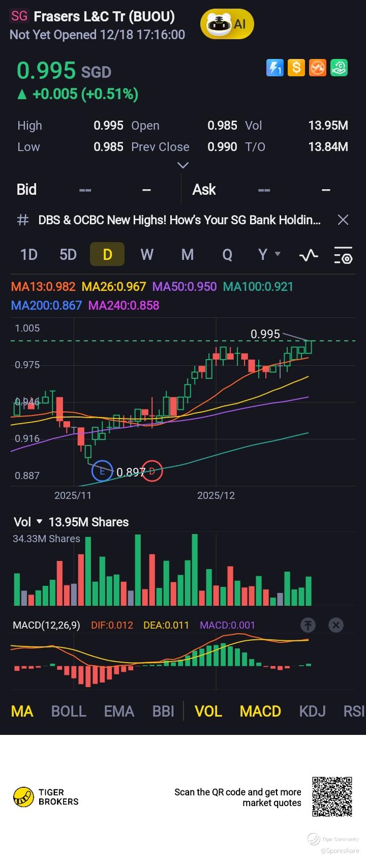 99.5 cents already, she may show us 1.01 soon! Frasers L&C Tr - Closed higher at 99 cents, looks rather positive!
