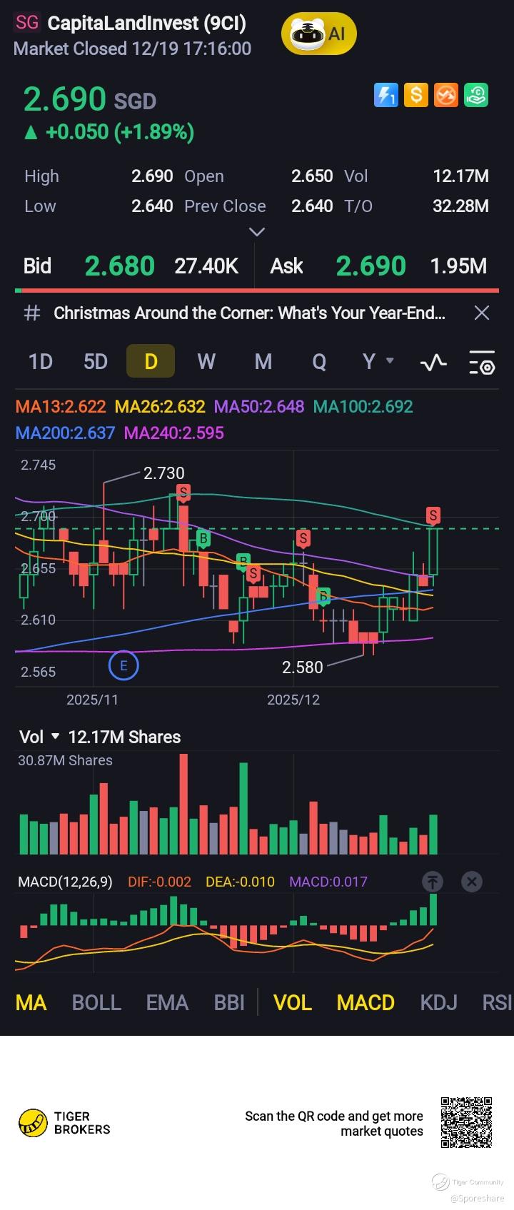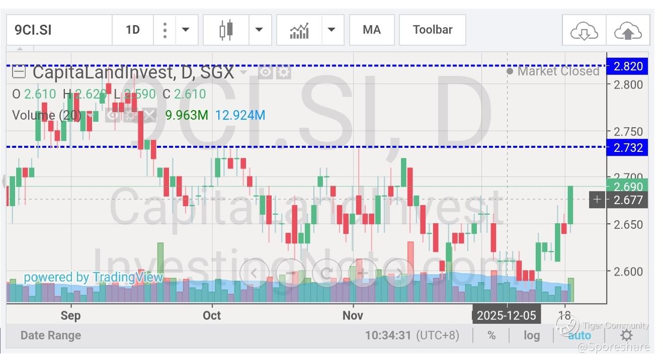 CapLand Investment - She is gaining strength likely to test 2.72 . A nice breakout smoothly plus good volume we may see her rising up further towards 2.82 and above !