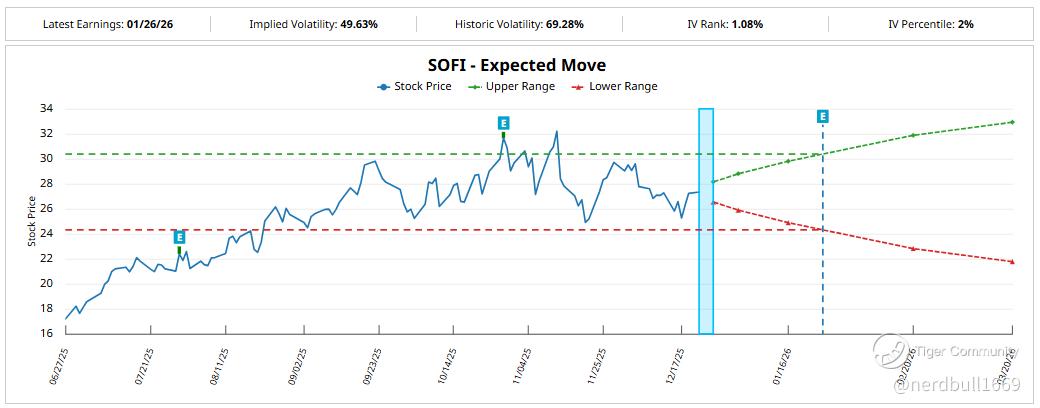 We are looking at strike price for 26 or 26.5, and these are below the expected move of 27.35. We will be getting 32 cents for strike price 26, and 45 cents for strike price 26.5. So if SoFi drops on Tuesday (23 Dec), we will need to pay attention because then we might be able to find the 26s.