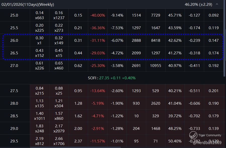 The expected move for SoFi is 27.35 for the week, but I think we can go deeper to 26 or lower. So looking at the option chain, for the expiration for the next two weeks, we might want to look at strike price at 26 or 26.5.
