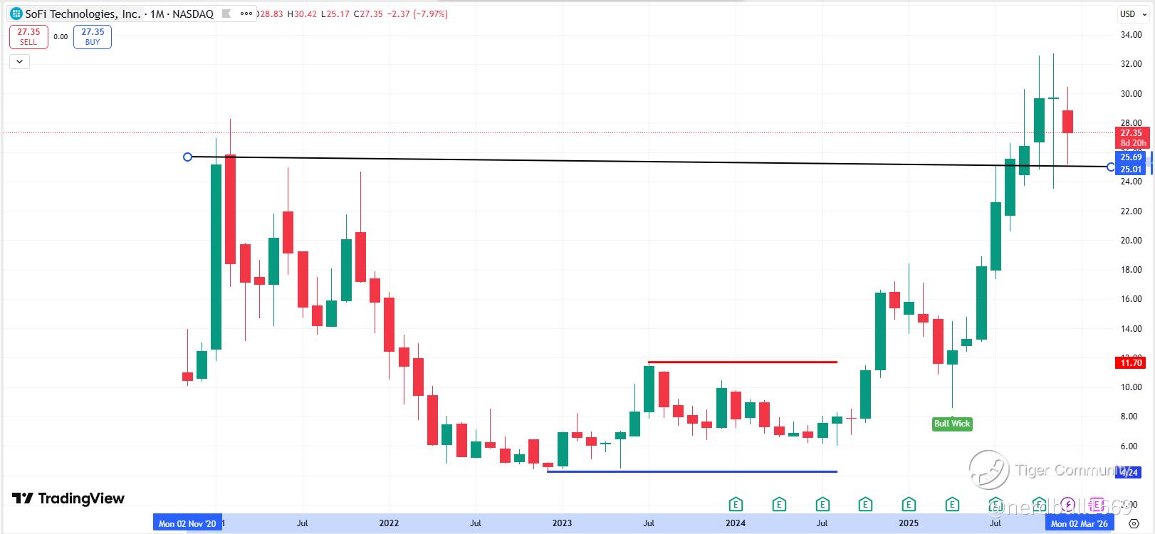 I think we can make this area on a technical standpoint. So if we looking for the monthly higher lows for more upside movement in 2026, we can see that trading is decent around 27 or lower. and not forgetting that SOFI PEG is at 1.1 and SoFi's (SOFI) Price-to-Sales (P/S) ratio varies slightly by source but generally hovers around 9.9x to 10x for the current trailing twelve months (TTM), with some estimates showing it as high as 11.91x, indicating investors are paying nearly $10 for every dollar of revenue, reflecting strong growth expectations for this growing fintech giant, though it's higher than traditional banks, typical for tech/growth stocks.