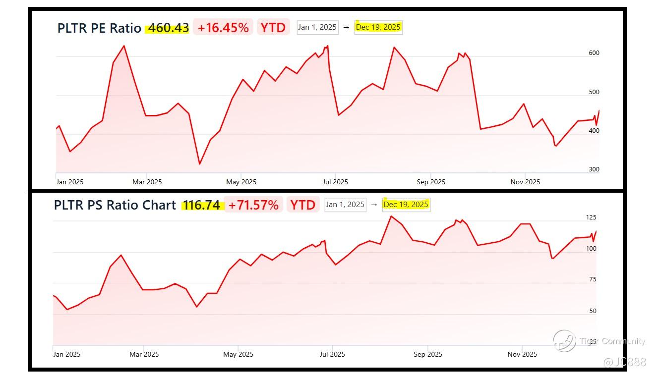 As of Fri, 19 Dec 2025, PLTR was trading at a price-to-earnings (P/E) ratio of 460.43, and even its 1-year forward P/E ratio was 184. (see above)