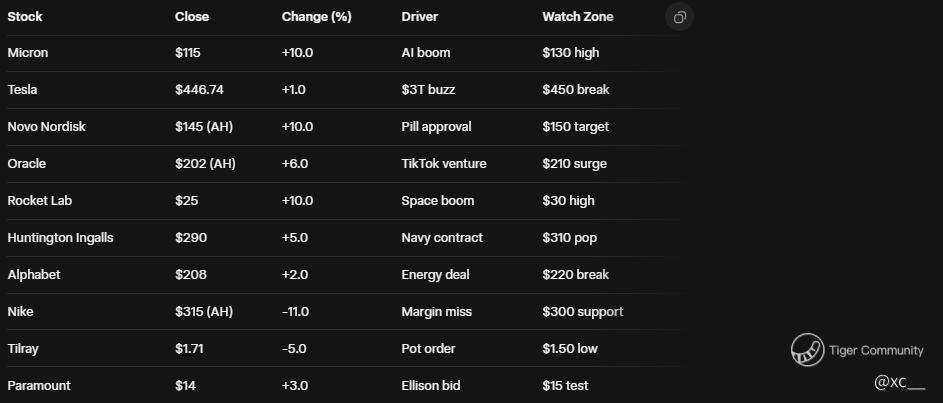 Stocks to watch: Micron (MU) for AI memory edge, Tesla (TSLA) on $3T dream, Novo Nordisk (NVO) on pill approval, Oracle (ORCL) data center test, Rocket Lab (RKLB) space boom, Huntington Ingalls (HII) Navy contract, Alphabet (GOOG) clean energy deal, Nike (NKE) consumer pulse, Tilray (TLRY) pot policy pops, Paramount (PARA) Ellison bid.