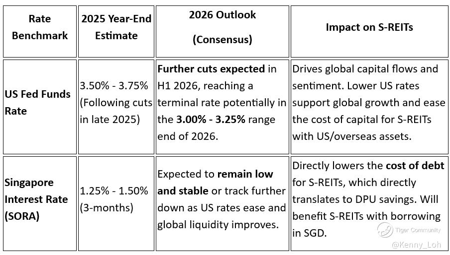 Singapore SORA: Expected to remain low or trend lower, directly reducing debt servicing costs for S-REITs with SGD borrowings.