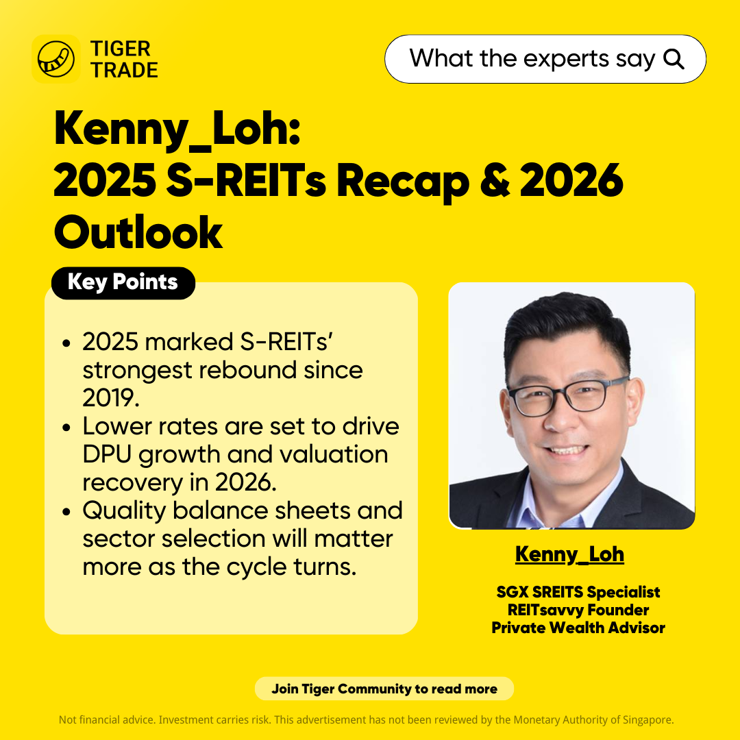 In his latest market outlook, @Kenny_Loh points out that 2025 is shaping up to be the strongest year for Singapore REITs (S-REITs) since 2019, with the sector benefiting from stabilising interest rates and the early phase of a rate-cut cycle. Looking ahead, he views 2026 as a potential inflection year, where S-REITs transition from recovery to renewed growth.