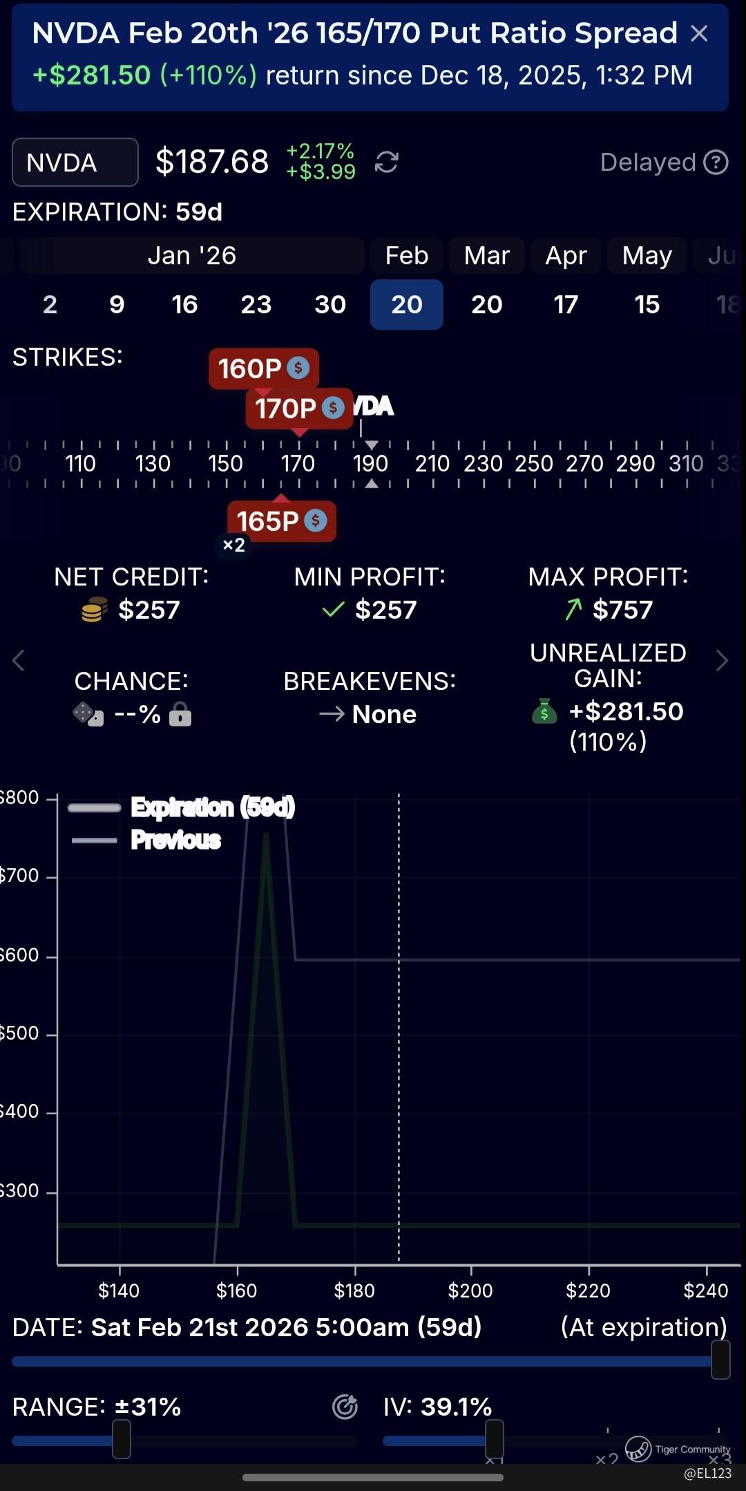 $NVDA 20260220 160.0 PUT$ 1:2 Put ratio spread plus new buy put. This forms a net positive butterfly. Minimally I will earn 200+ without risk.