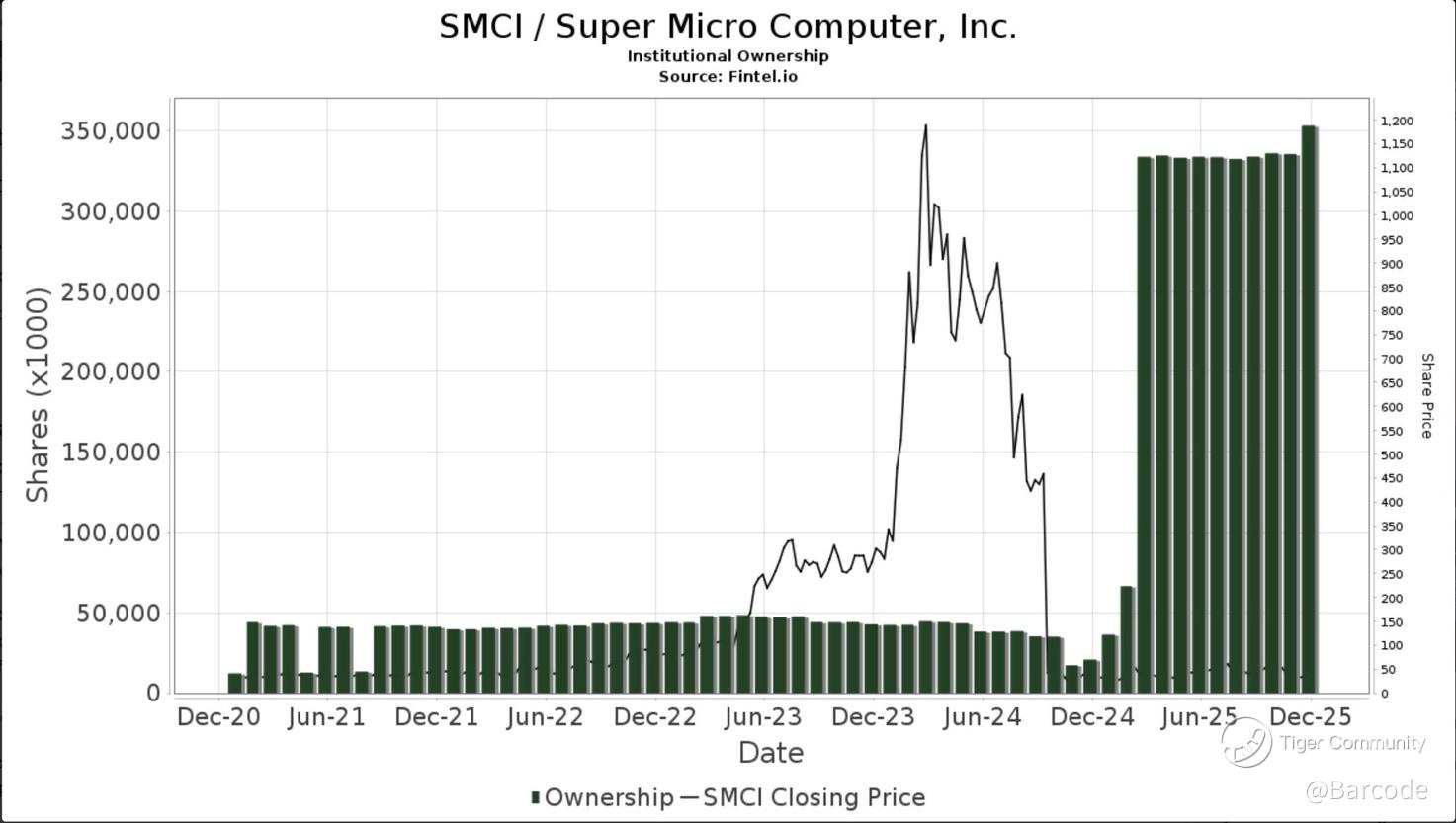 Iβm watching institutional ownership in $SMCI push to all time highs, and this is not background noise. This is sponsorship. While price has already absorbed a violent repricing cycle, institutions have continued to accumulate, not distribute. That divergence matters. It signals weaker hands exiting during volatility while long duration capital steadily absorbed supply.