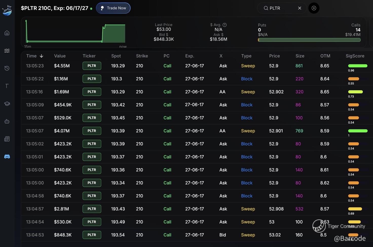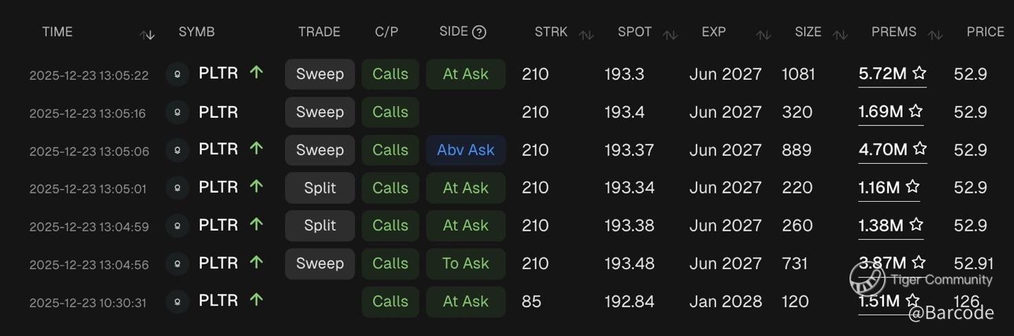 Iβm seeing over $19M in premium flow into Palantir June 2027 $210 calls, with additional size extending into 2028. These contracts were bought to open, clustered, and largely lifted at the ask. This is not short-term gamma or tactical hedging. This is capital committing to duration.