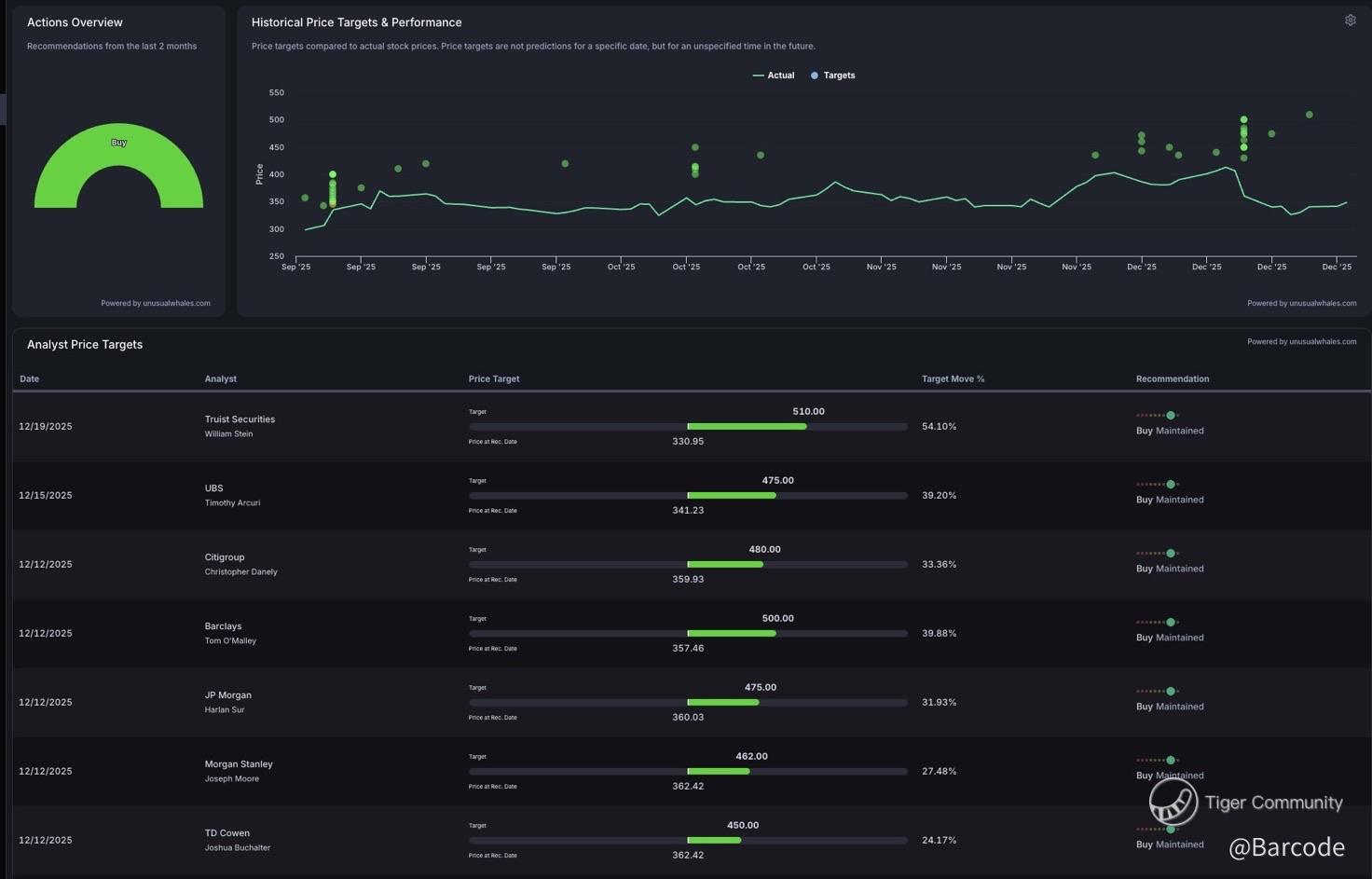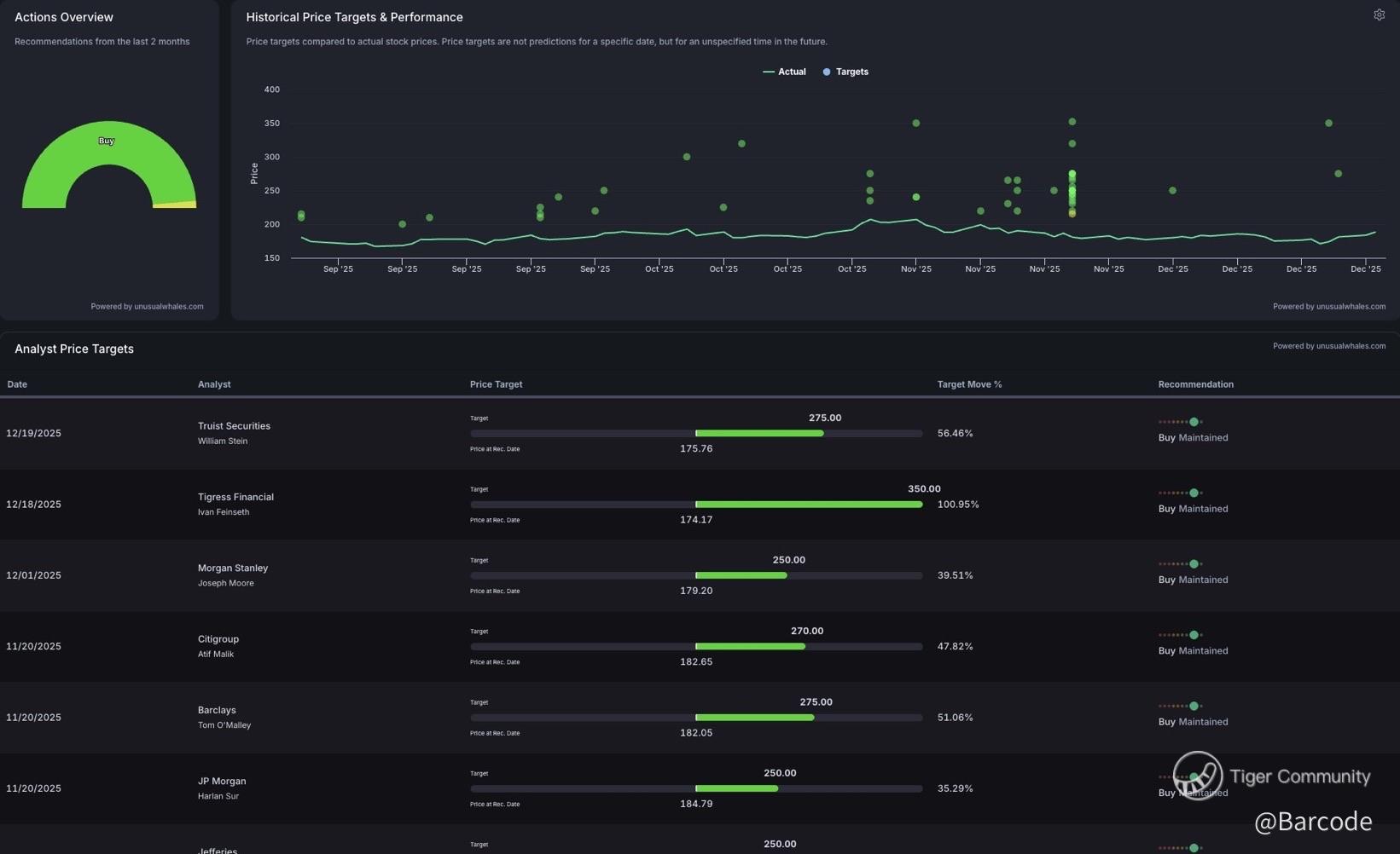 Nvidia continues to sit at the centre of the AI complex. Shares are up more than 2% on the session, with roughly 97% of analysts maintaining buy ratings over the past two months. What stands out to me is not optimism, but stability. Consensus has held firm despite enormous gains, suggesting conviction is keeping pace with valuation. $NVDA bears getting steamrolled π€!