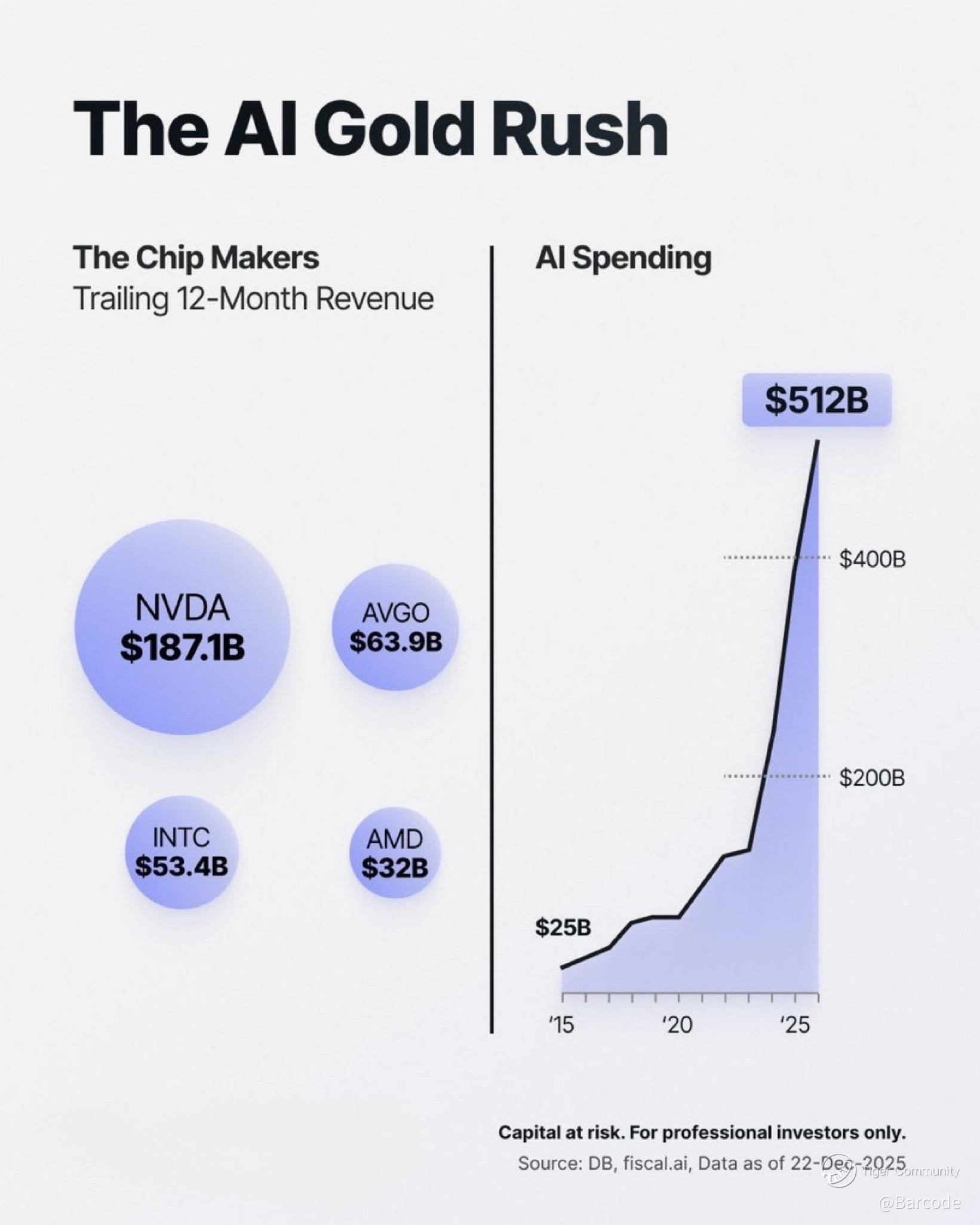 The AI spend chart ties this together cleanly. Global AI investment has expanded from roughly $25B in 2015 to over $512B in 2025. That scale of growth forces capital further along the value chain. Chips first, infrastructure next, and now increasingly into software platforms that monetise inference, deployment, and data advantage.