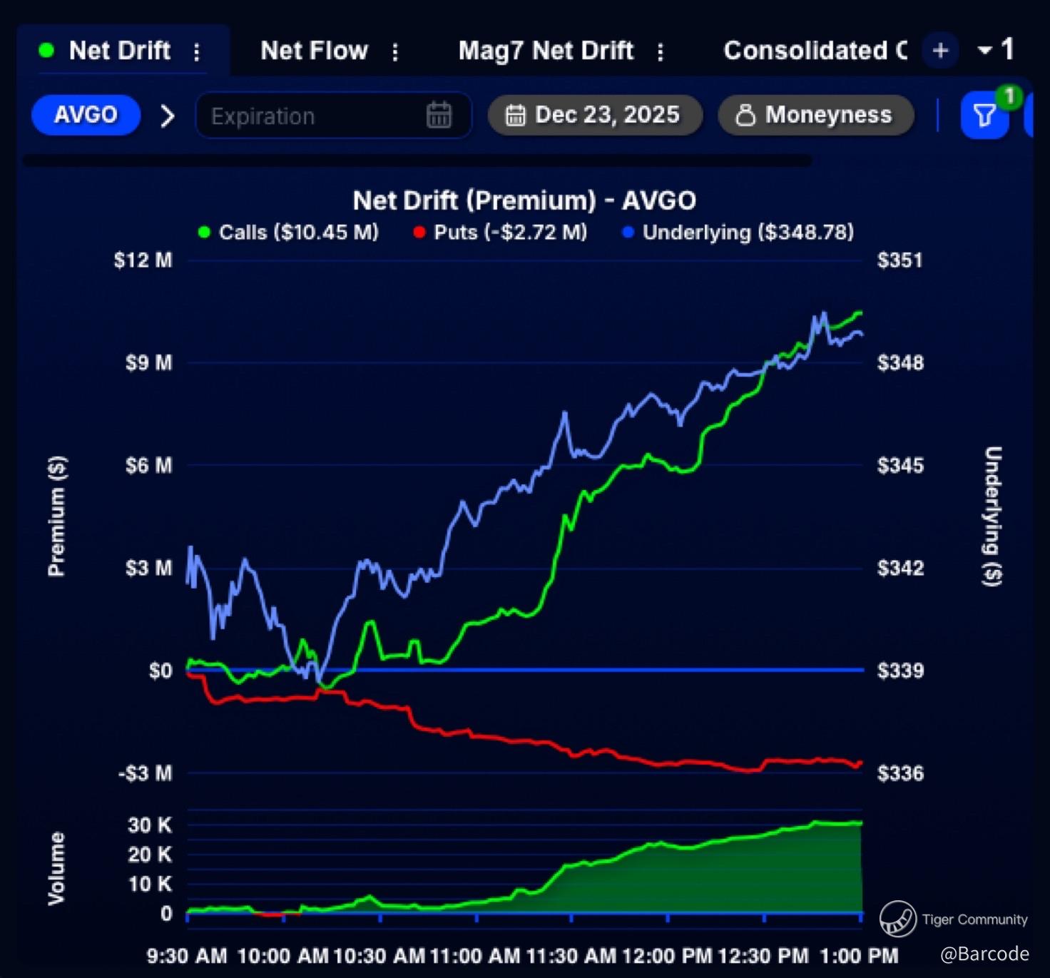 At the same time, Broadcom is behaving exactly as the options data suggests it should. Over $10M in single-leg calls crossed intraday, call premium dominated, put pressure stayed muted, and price followed premium higher by more than 2%.