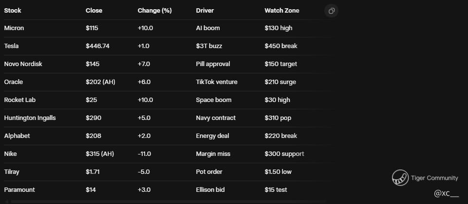 Stocks to watch: Micron ( $Micron Technology(MU)$ ) for AI memory edge, Tesla ( $Tesla Motors(TSLA)$ ) on $3T dream, Novo Nordisk ( $Novo-Nordisk A/S(NVO)$ ) on pill approval, Oracle ( $Oracle(ORCL)$ ) data center test, Rocket Lab ( $Rocket Lab USA, Inc.(RKLB)$ ) space boom, Huntington Ingalls (HII) Navy contract, Alphabet (GOOG) clean energy deal, Nike (NKE) consumer pulse, Tilray (TLRY) pot policy pops, Paramount (PARA) Ellison bid.