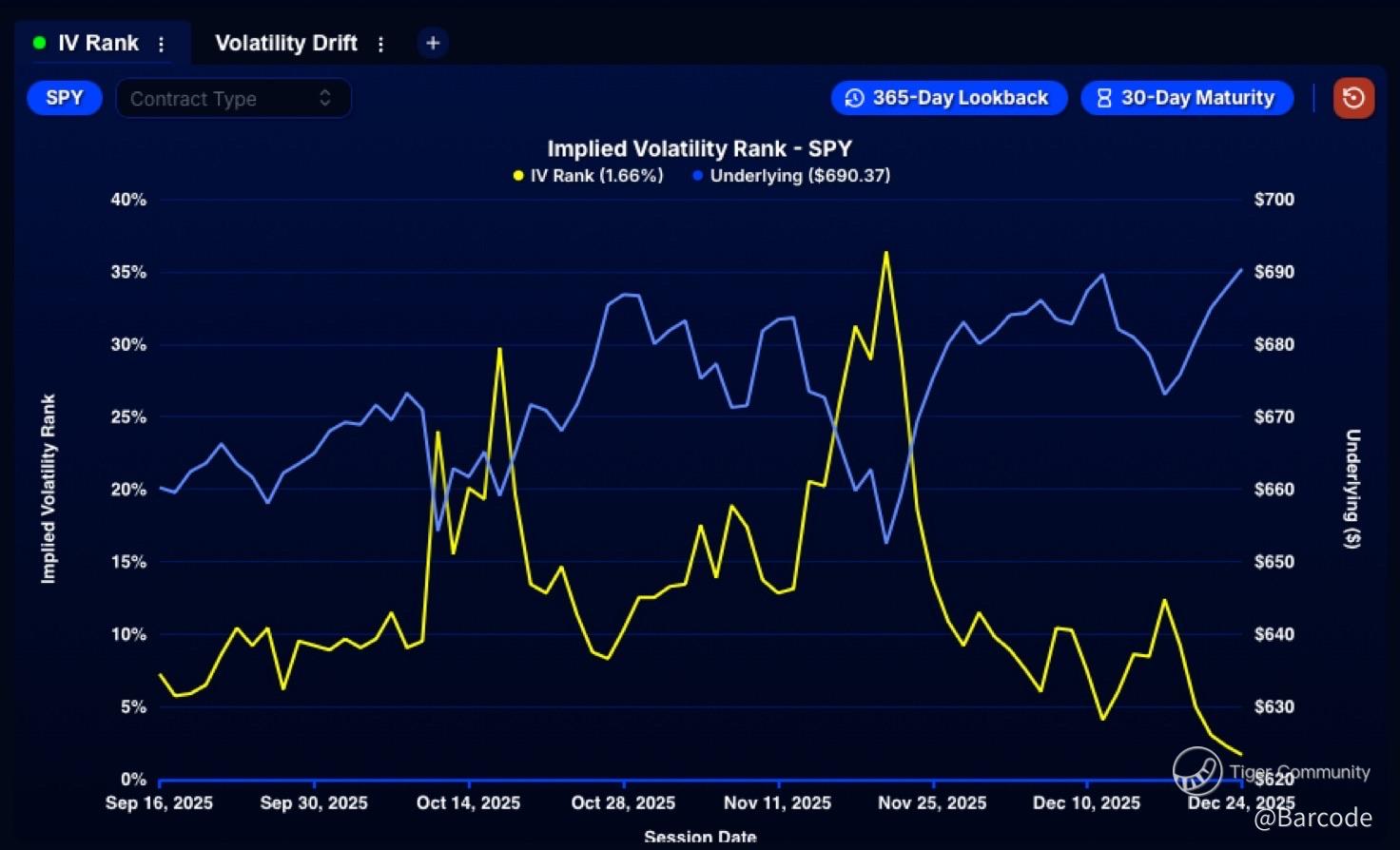π IV Rank on $SPY is now 1.66%, an extreme compression signal. Markets do not stay priced for calm indefinitely. When volatility collapses to this degree, the next phase is typically driven by positioning and flow, not headlines.