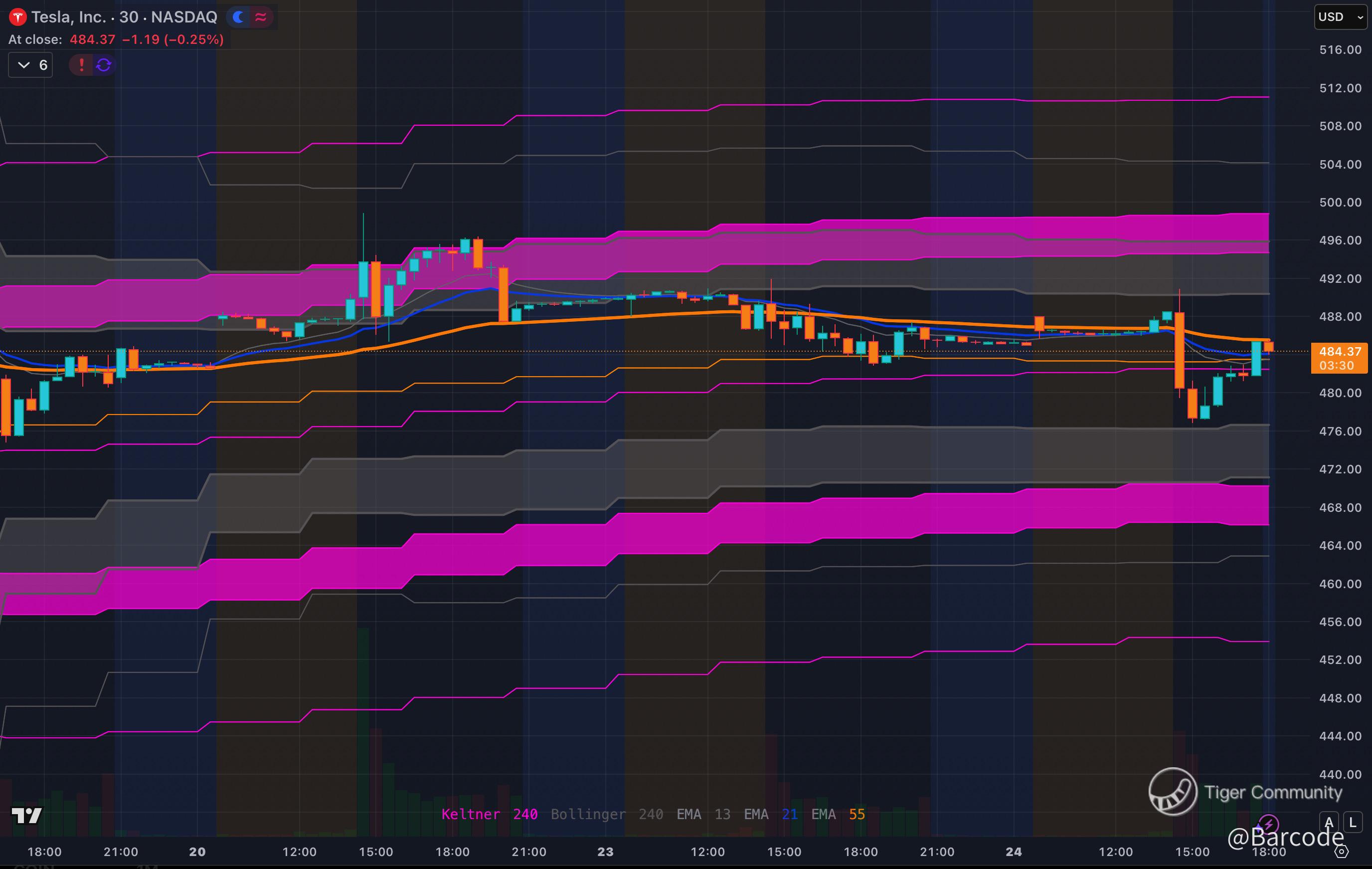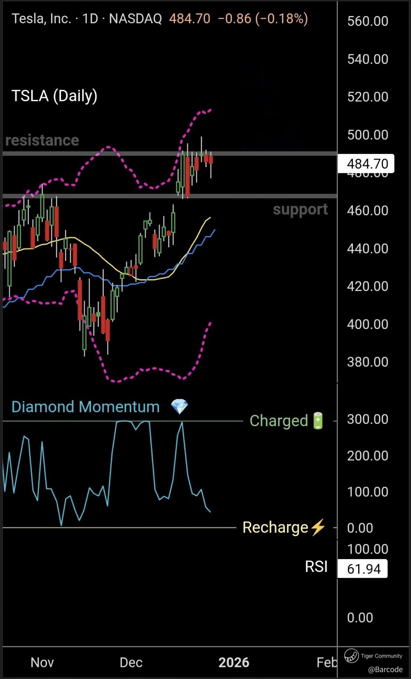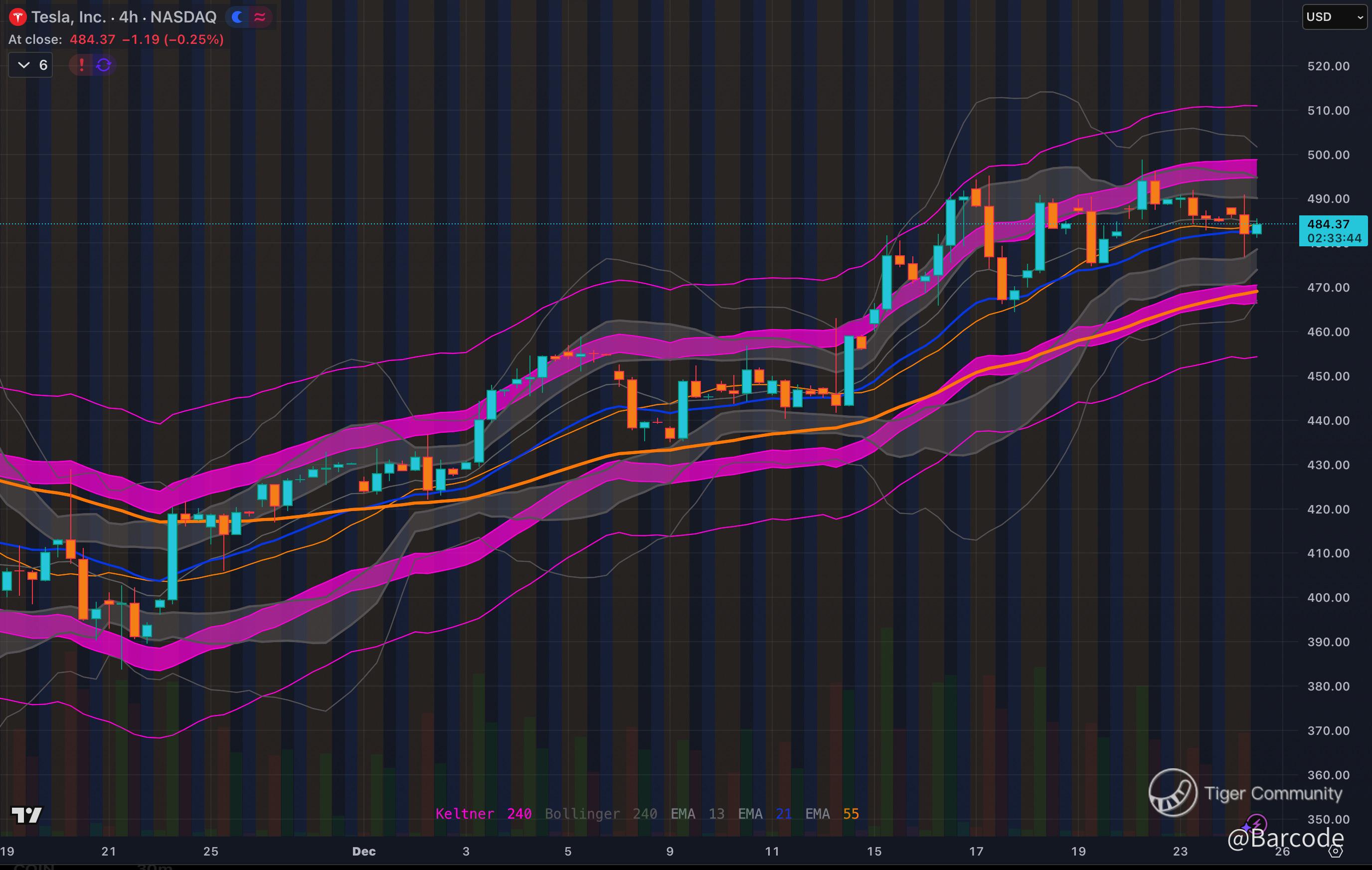 On the daily chart, Tesla continues to print higher lows while pressing into a clearly defined resistance zone. RSI in the low 60s reflects controlled momentum, not excess. On the 4H structure, price remains supported within the Keltner and Bollinger framework, with moving averages stacked constructively beneath. Pullbacks have been shallow and consistently absorbed. Repeated tests weaken supply. This is how ceilings give way.