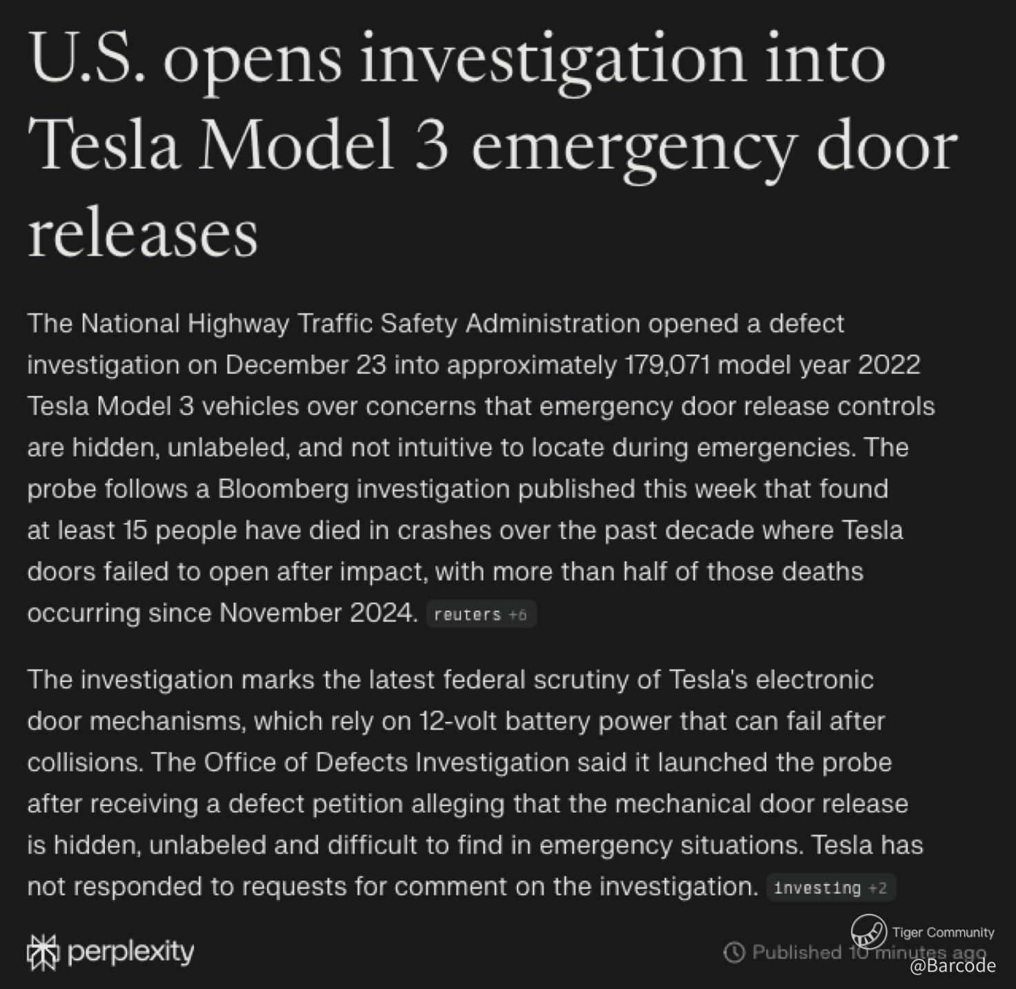 NHTSA has opened a defect petition covering approximately 179,071 Tesla Model 3 vehicles related to concerns around a mechanical emergency door release that may not be easily accessible. This is not a demand issue. It is about regulatory optics. Another investigation keeps safety scrutiny on Tesla and adds headline risk, even if no recall materialises. Markets tend to overreact to these probes initially and then recalibrate once scope and impact become clearer.