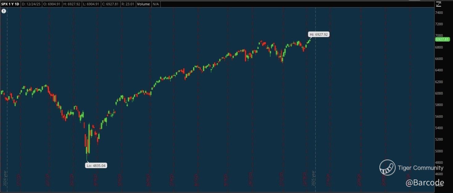 This is a textbook Santa Rally environment. Volatility is crushed, positioning is directional, and both SPDR S&P 500 ETF Trust ($SPY) and S&P 500 Index ($SPX) are printing fresh all-time highs. This has not been a euphoric melt-up. It has been a controlled grind higher, and historically those trends tend to persist longer than most expect.