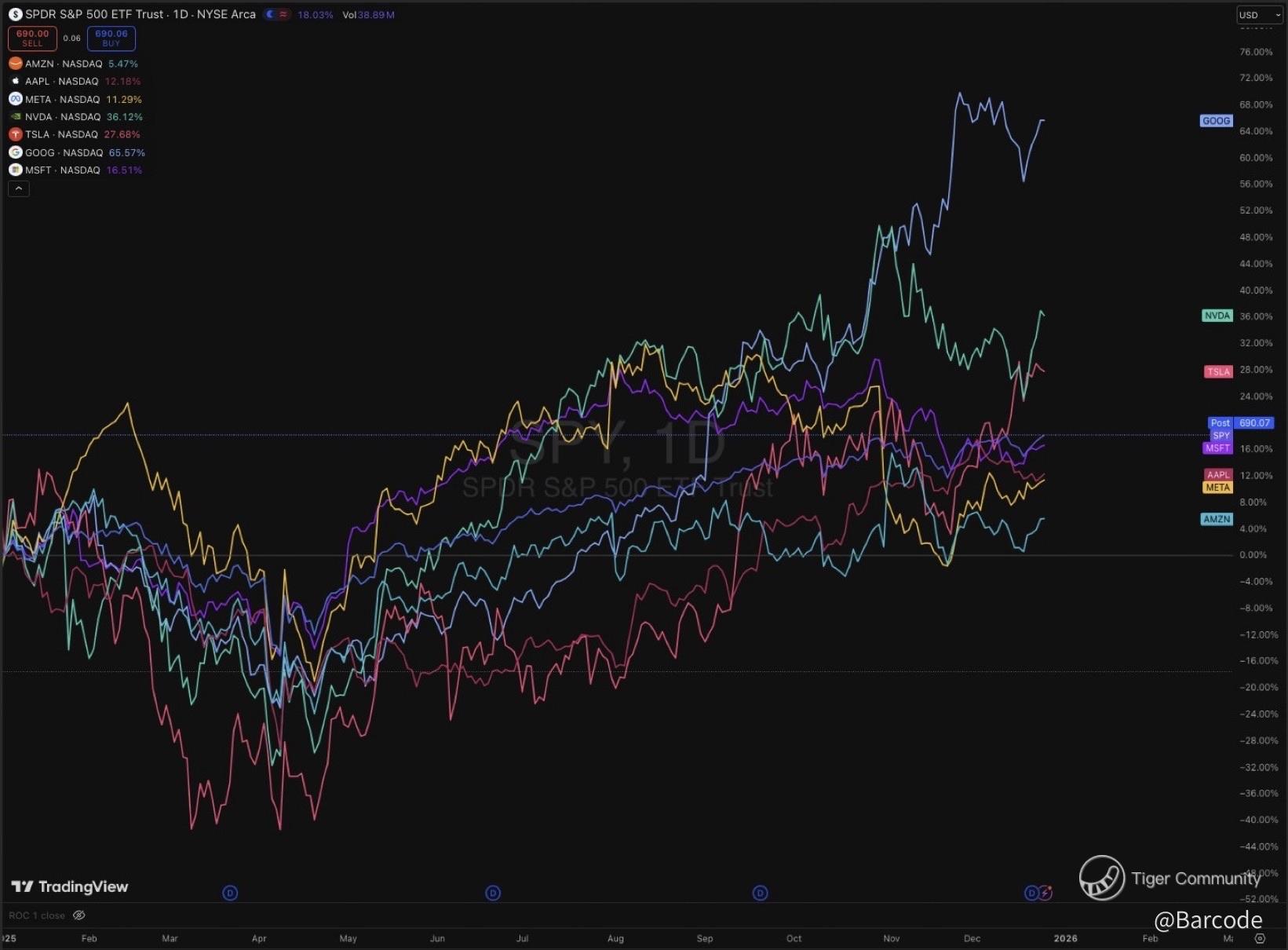 π YTD performance across the Magnificent Seven reinforces why this grind has persisted rather than stalled.
