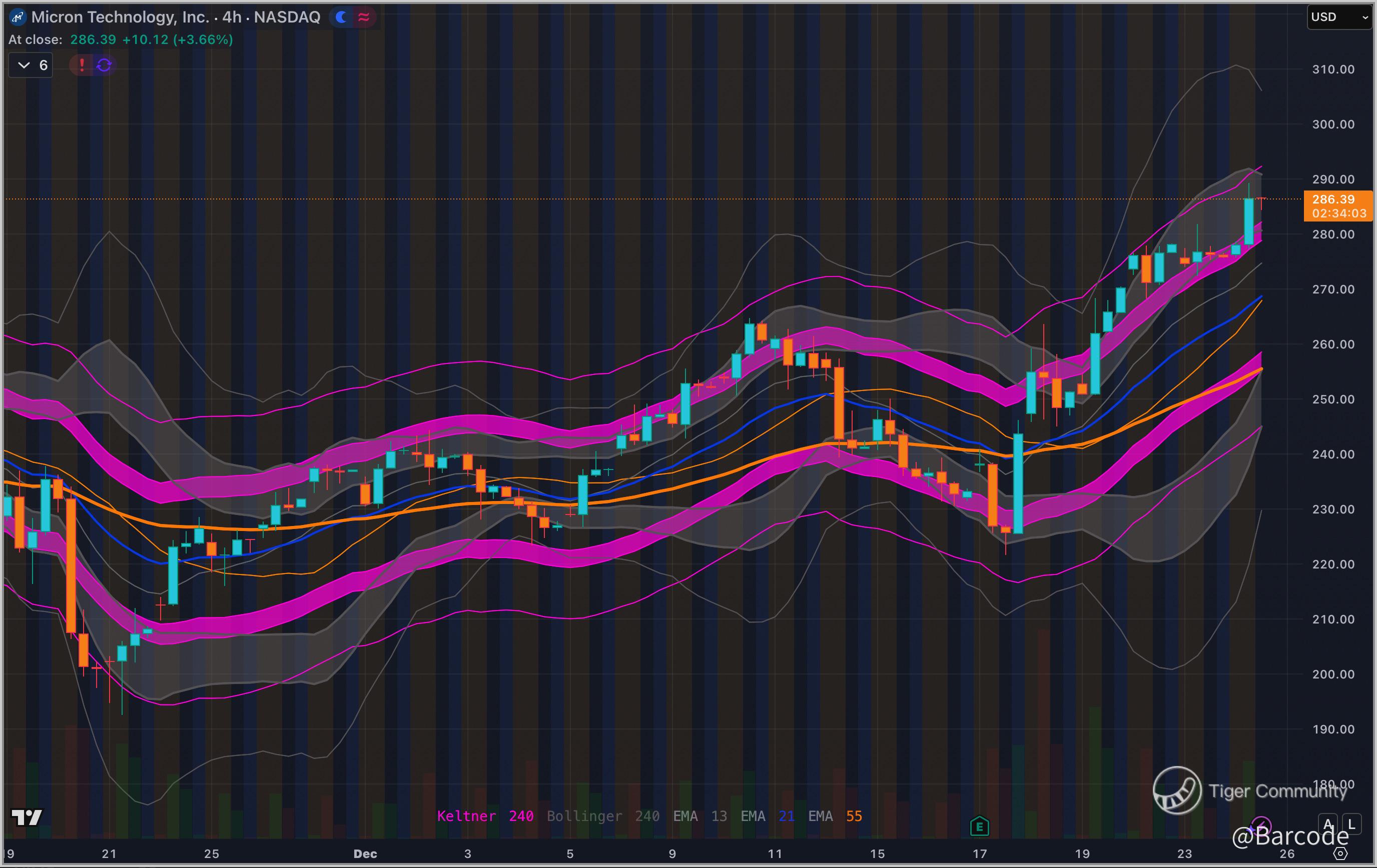 Micron is moving after reports that Samsung and SK Hynix raised HBM3E memory prices by roughly 20%, an unusual move ahead of next-generation launches. That tells me demand remains structurally tight. Strong AI demand from Nvidia, Google, and Amazon is keeping pricing firm. When memory suppliers raise prices into a launch cycle, margin expansion typically follows. From a structure standpoint, Micron is already trending higher with expanding bands and improving momentum. This is confirmation, not coincidence.