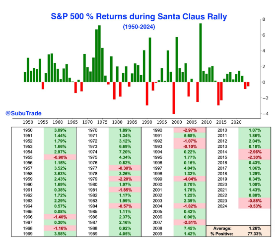 The normal Santa Claus Rally begins on Wednesday (last 5 trading days of the year + the first 2 of the New Year) 🚨 Although Santa gave us a lump of coal the previous 2 years, it has never happened 3 times in a row in the history of the S&P 500 🤑🥳