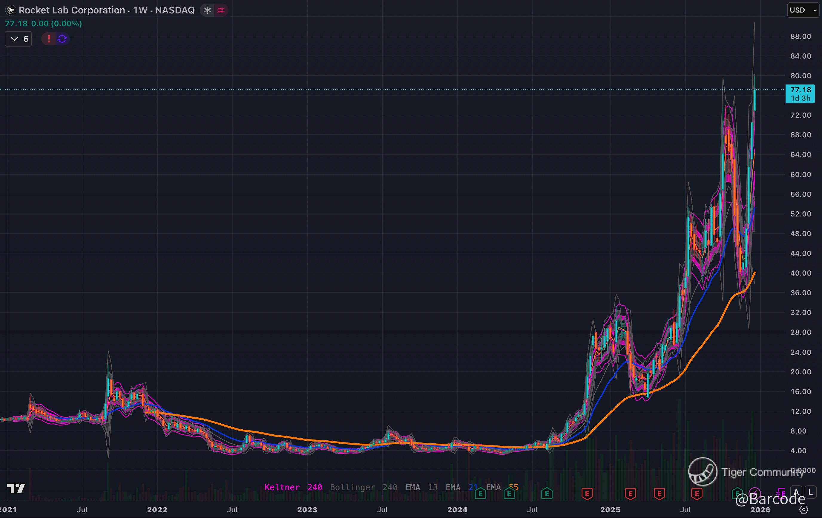 On the monthly chart, Rocket Lab printed a bullish engulfing candle and secured acceptance above the 1.618 log Fibonacci extension. That level is not cosmetic. It separates trend continuation from terminal extension.