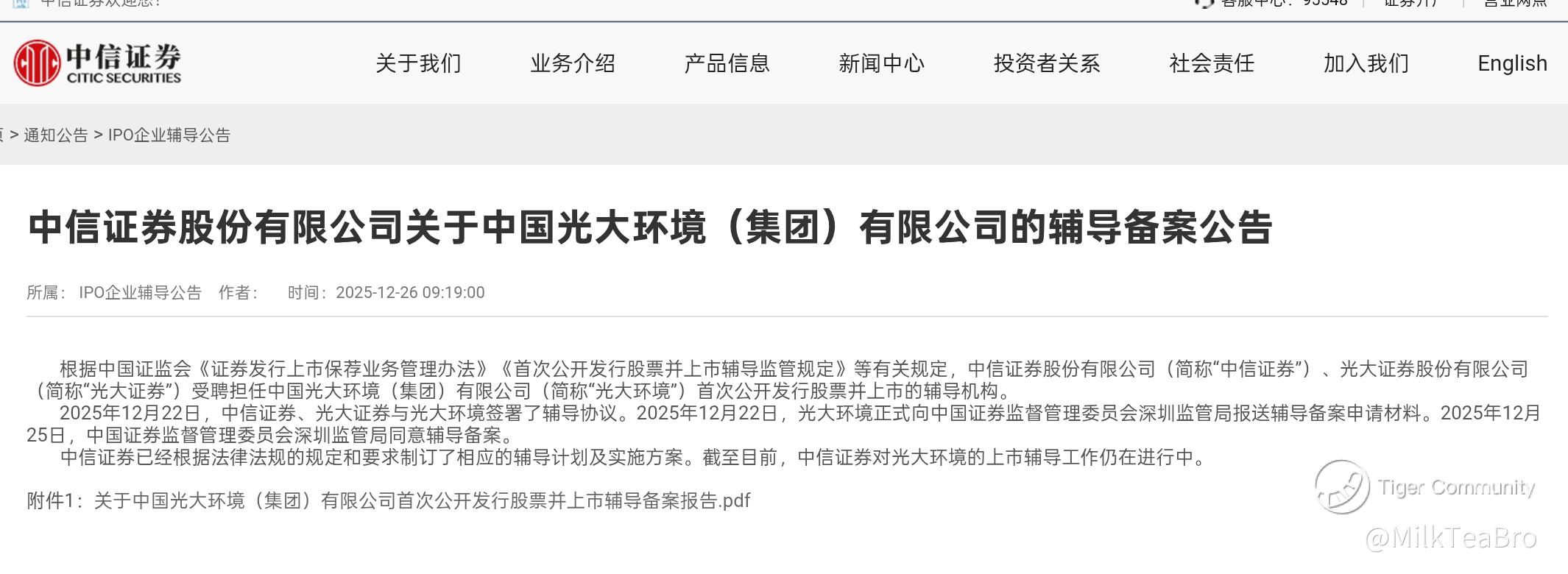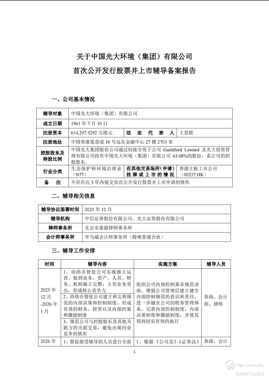 According to the China Securities Regulatory Commission (CSRC) website, China Everbright Environment Group Limited (hereinafter "Everbright Environment"), a company listed on the Hong Kong Stock Exchange, has filed for and completed tutoring registration with the Shenzhen CSRC bureau, officially commencing its IPO preparation process. The tutoring institutions are CITIC Securities and Everbright Securities.