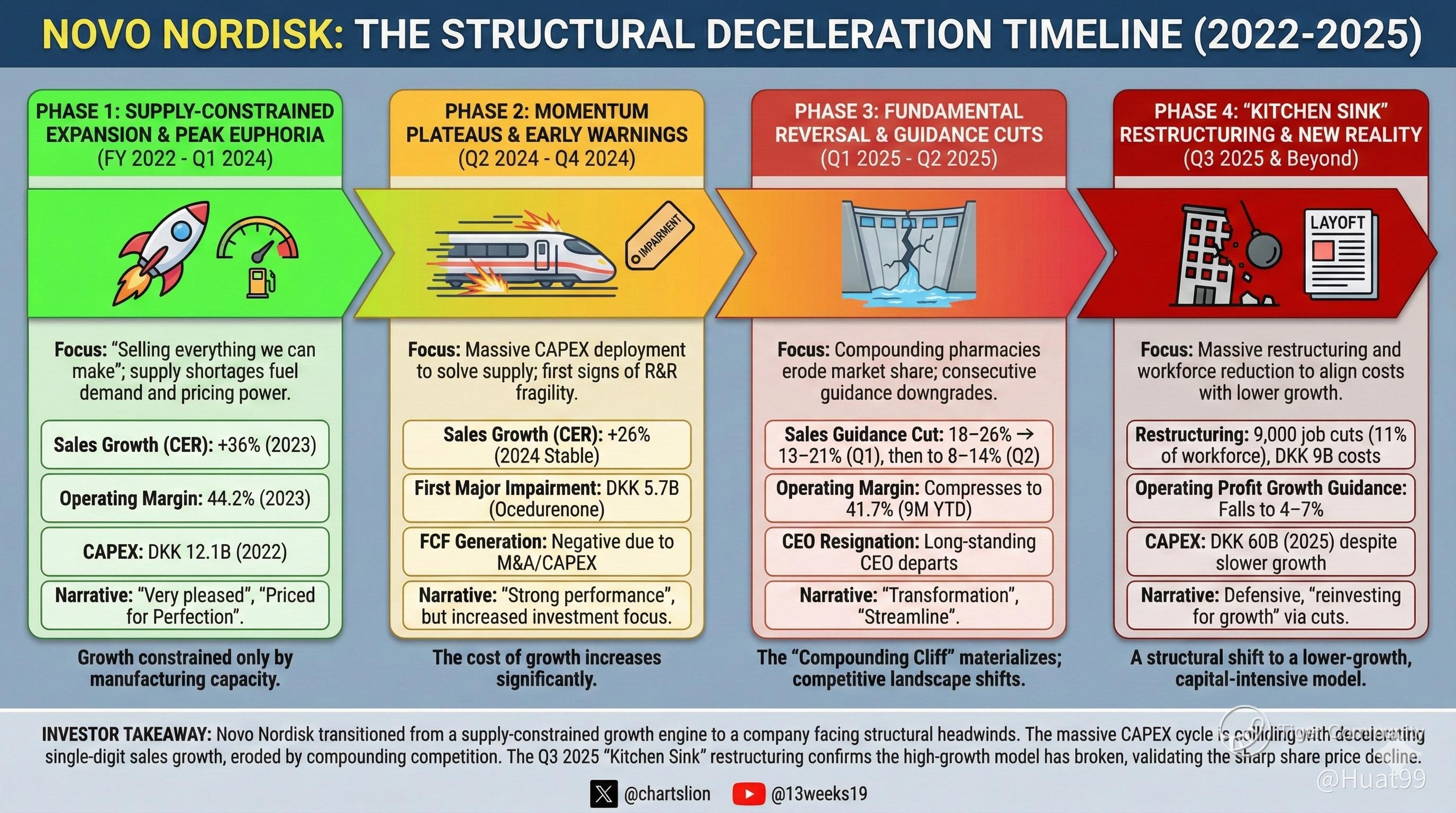 šļø Phase 4 (Late 2025): The "Reset." 9,000 layoffs and DKK 60B CAPEX collide with single-digit growth.