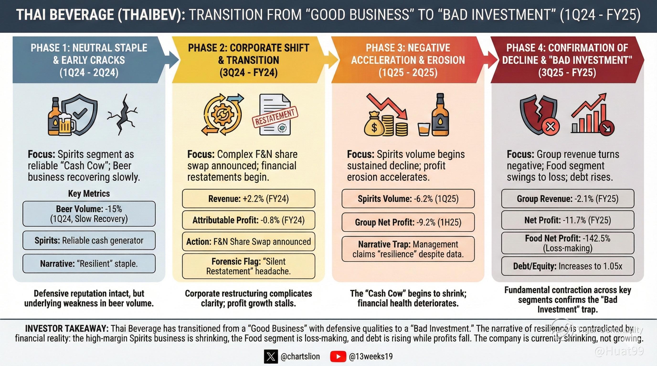 ThaiBev is currently a "Good Business, Bad Investment." The core brands are famous, but the business is bleeding in its high-profit areas (Spirits) and losing money in its growth areas (Food).
