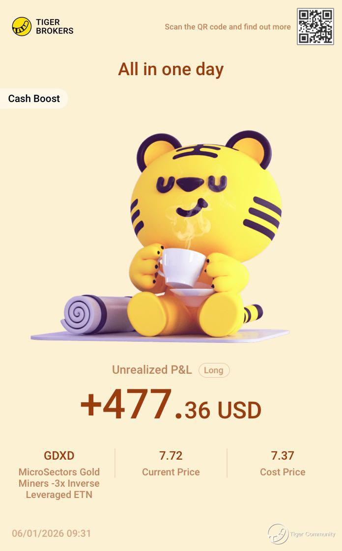 $MicroSectors Gold Miners -3x Inverse Leveraged ETN(GDXD)$ is on a roll! GDX surged 3.17% on Jan 5, short-term pullback expectations drive GDXD higher, 2x leverage amplifies steady profits!