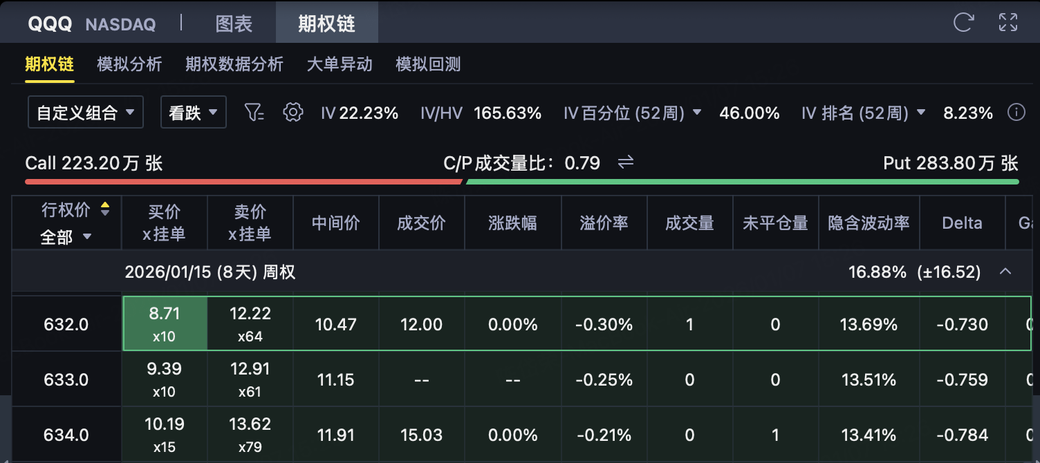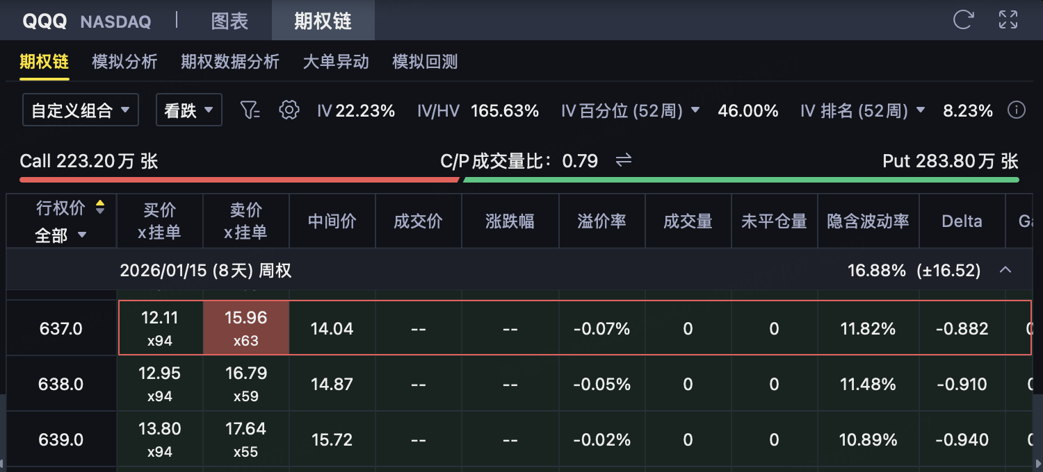 (1) Buy a higher strike price Put (main source of income) Investors buy a strike priceK ₂ = 637Put options, pay premium$14.04。 This Put is closer to the current price and most sensitive to QQQ declines, making it a core source of earnings for this strategy. When QQQ falls, the intrinsic value of this Put will increase rapidly.