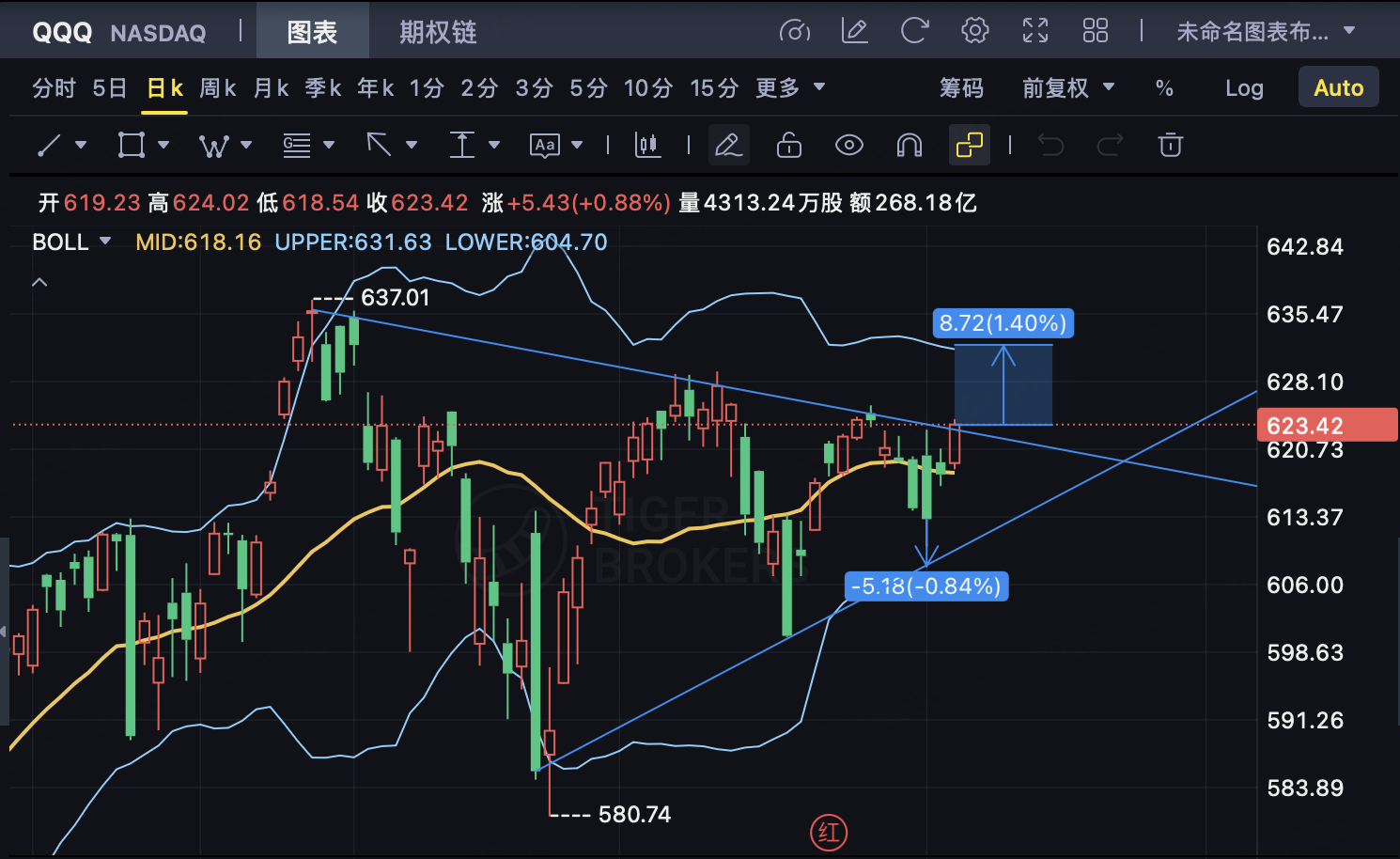 Taken together,Large-cap leading stocks gain weakly + interest rate policy remains stable, making the Nasdaq 100 ETF (QQQ) lack strong upward momentum in the short term, while the small and medium-cap sectors continue to rotate. This landscape provides investorsShorting QQQ or Building a Bear Market Put Spread StrategyOpportunities: It can not only capture the benefits brought by the potential correction of leading stocks in the large cap, but also control risks through the spread strategy.