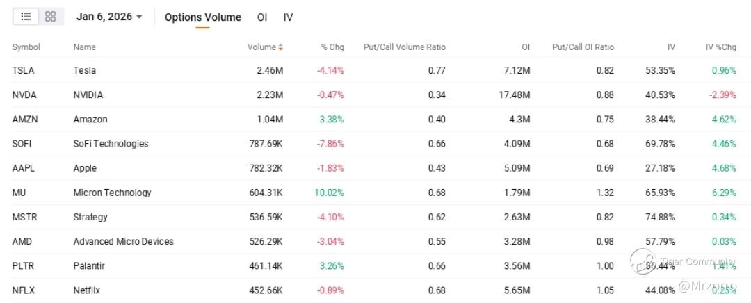 Among the top 10 stocks by options volume, $Tesla Motors(TSLA)$ has the highest put/call trading volume ratio at 0.77. Tesla shares fell 4.1% as Nvidia unveiled its Alpamayo autonomous driving AI platform at CES, intensifying competition in the robotaxi market with partners including Mercedes-Benz and other automakers adopting the technology.