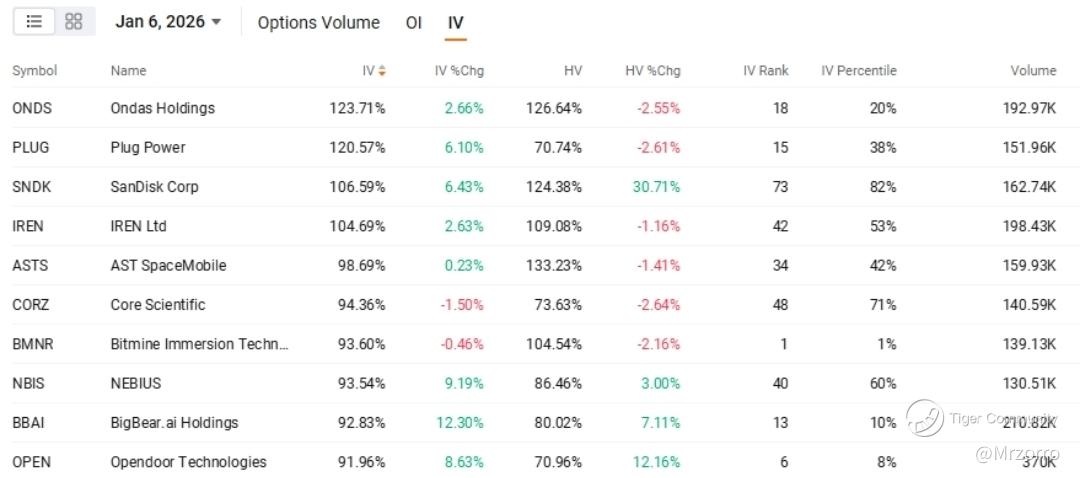 $Ondas Holdings Inc.(ONDS)$ has the highest implied volatility at 123.71%, up 2.65% from the previous session. Ondas Holdings secured $10 million in new autonomous systems orders, rebranded to Ondas Inc., relocated headquarters to West Palm Beach Florida, and announced an investor day for January 16th to present its 2026 business plan including projected revenue growth to $110 million.