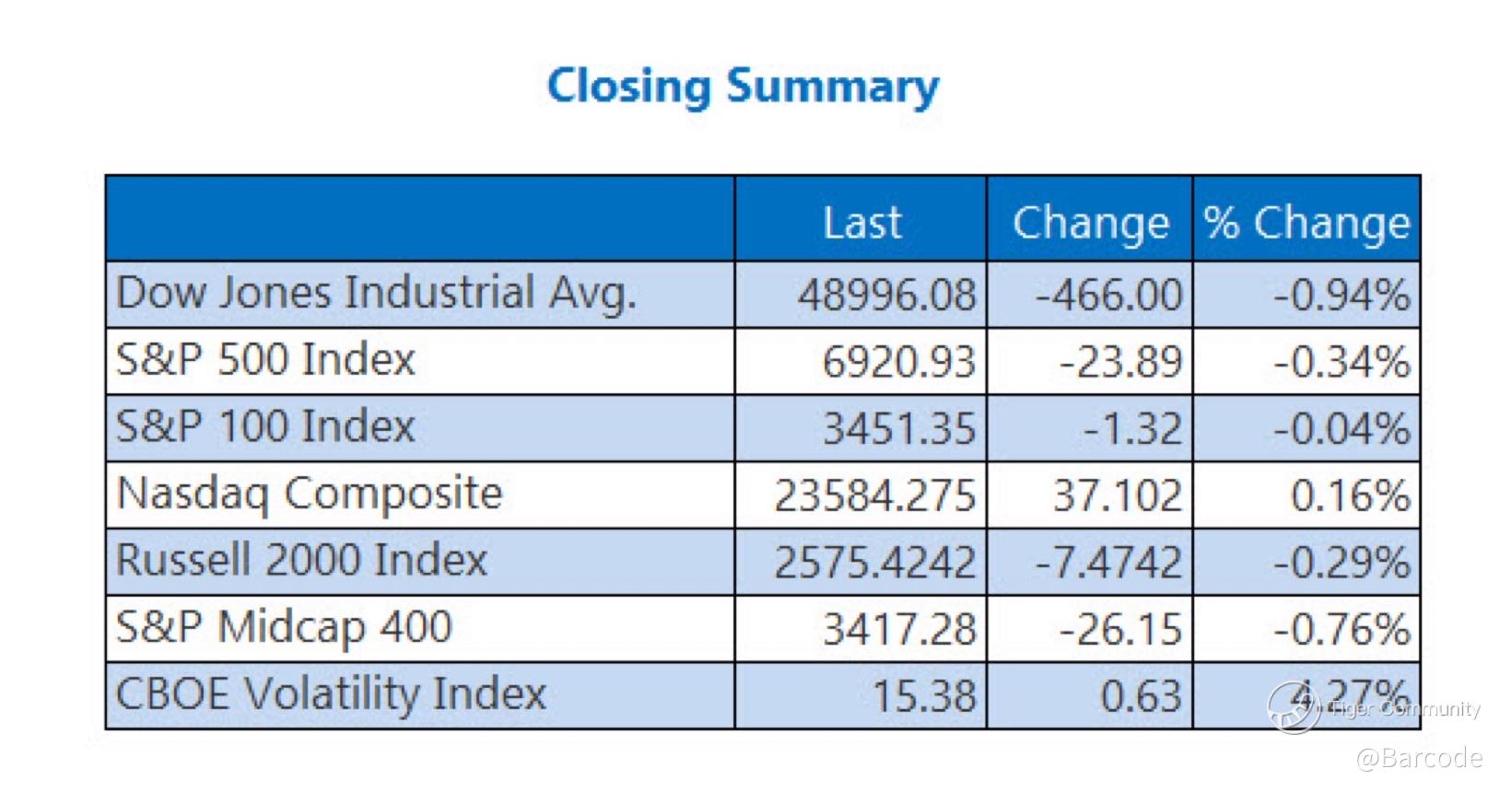 Iβm watching a market that continues to look stable at the index level while internal stress builds beneath the surface β οΈ. U.S. equities faded from record highs with the Dow Jones Industrial Average sliding 466 points, its worst % decline since 18Nov, closing at 48,996 π. The S&P 500 closed lower at 6,920, down -0.34%, while the Nasdaq Composite extended its relative strength with a third straight gain to 23,584, up +0.16% π. That divergence mattered. Mega cap tech again absorbed selling pressure, masking weakness across cyclicals, housing, and defence. The Russell 2000 slipped -0.29% and the S&P Midcap 400 fell -0.76%, confirming rotation pressure away from broader risk.