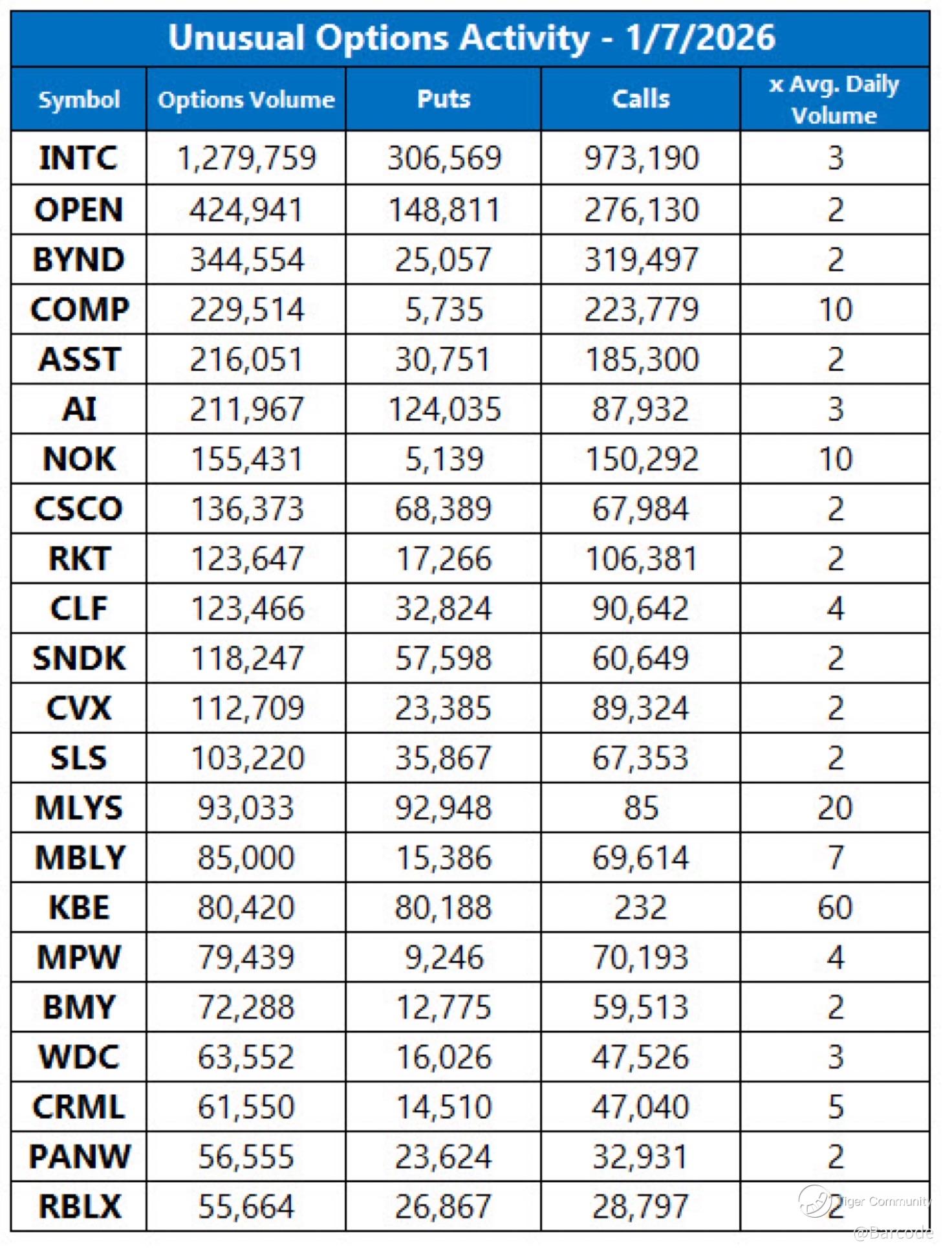 Iβm watching options markets closely because they revealed how positioning adjusted under the surface π―. Intel led activity with 1.28M contracts traded, roughly 3x average daily volume, skewed heavily toward calls after tagging a new 52-week high early before paring gains π. Memory names also saw heavy call buying, with Sandisk trading roughly 3x ADV, reinforcing bullish skew tied to AI demand acceleration.