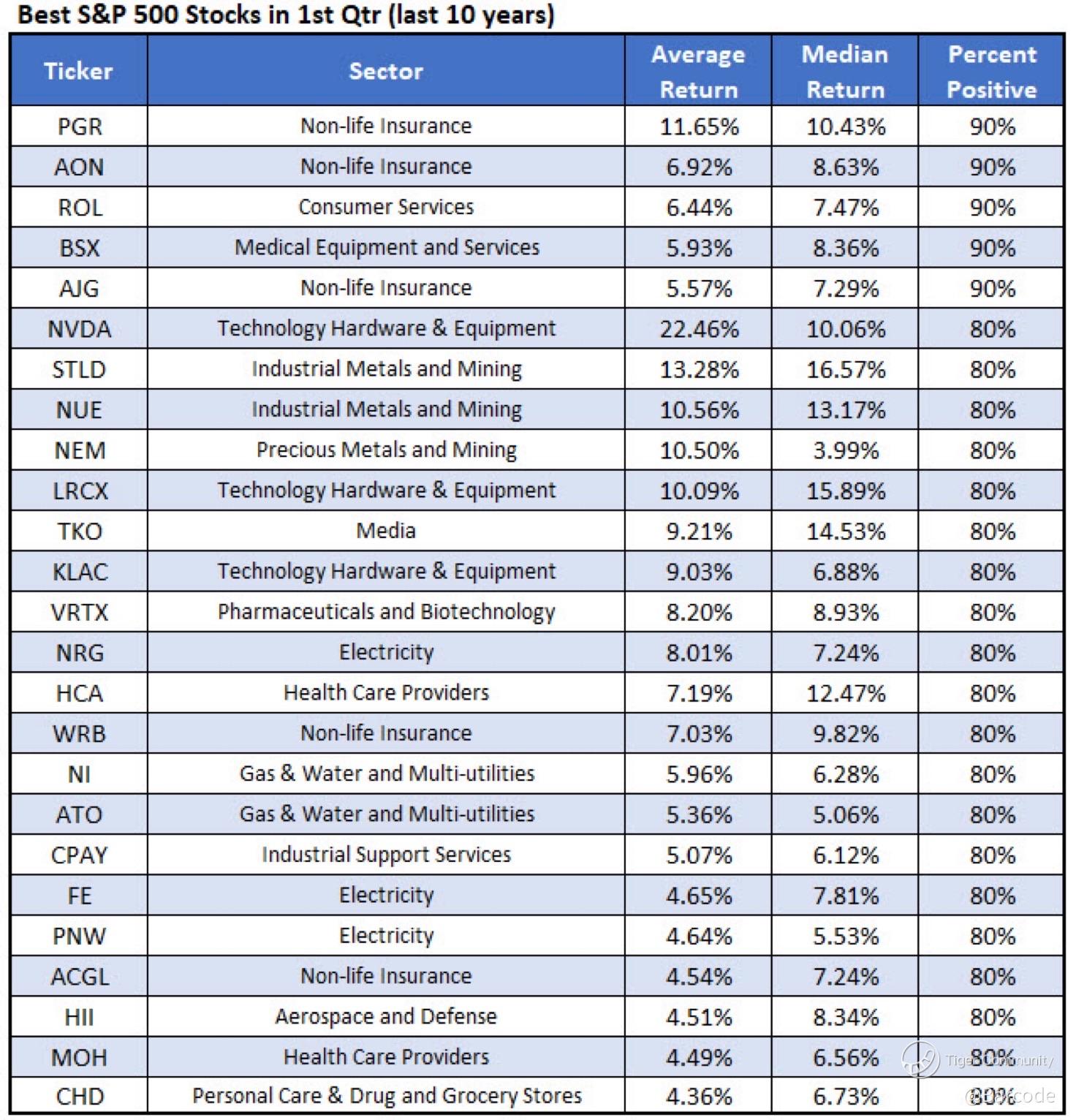 Iβm also anchoring expectations with first-quarter seasonality, which has been even more consistent than January alone. Over the past decade, insurance, semiconductors, industrial metals, and select utilities have delivered the strongest Q1 outcomes, with many names showing 80%+ positive hit rates. Standout leaders include NVDA in AI hardware, STLD and NUE in industrial metals, and PGR, AON, and AIG across non-life insurance. Iβm treating this as a confirmation layer, not a signal, but when breadth stabilises, this historical bias matters.