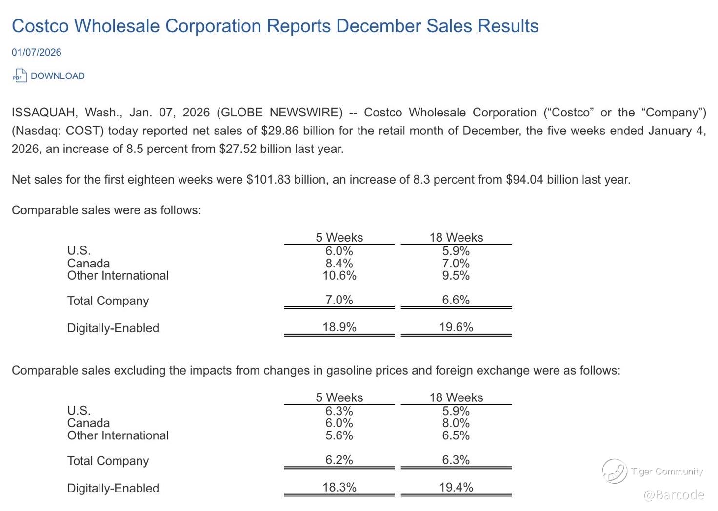 Retail remained a pocket of consistency π. Costco reported December net sales of $29.9B, up +8.5% y/y, comparable sales of +7.0%, digital comps of +19%, and FYTD sales growth of +8.3%. Traffic trends and online momentum continue to underline Costcoβs defensive growth profile.