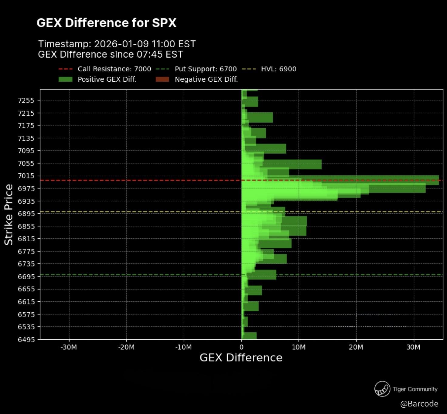 π Calls just crossed Puts on $SPY as premium flipped to $2.55M Calls vs $469.13K Puts with the underlying ripping to $693.02. $SPX stayed all green while GEX flipped positive with put support at 6700, HVL 6900 and call resistance 7000, classic liquidity flush then flow flipped. RSI breadth keeps improving as 5 day and 14 day RSI >70 names rise without the market going extreme and stocks above upper Bollinger Bands expand.