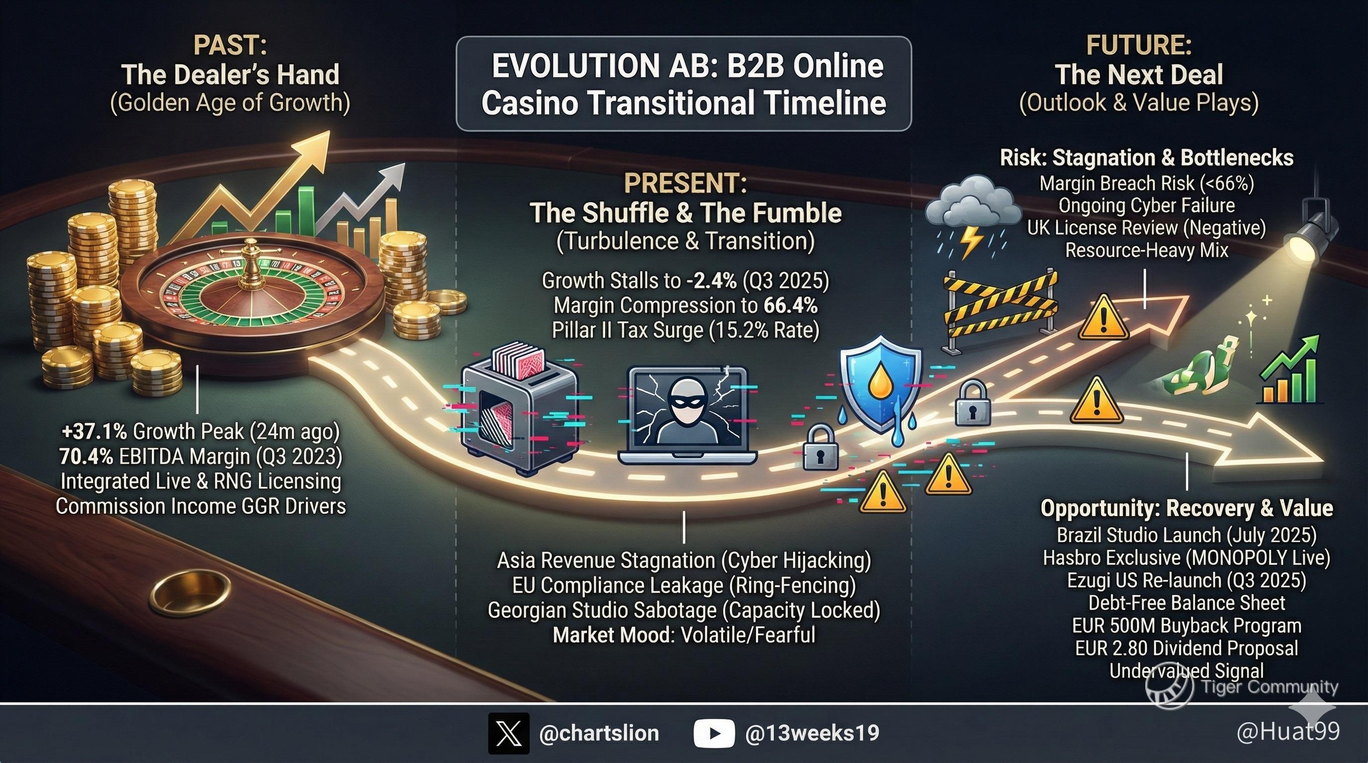 Evolution was once the dominant B2B live-casino growth machine. Today, growth is being dragged down by **cyber attacks, higher global taxes, and self-inflicted compliance leakage**.