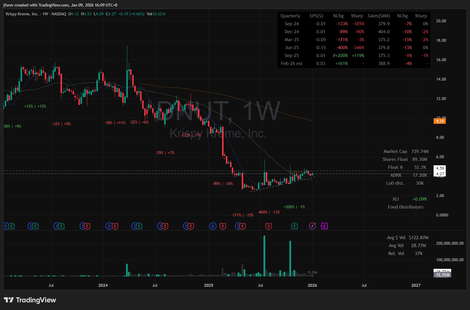 Price has been tightening since Q3 earnings following a +119% beat. Q4 estimates point to +161% EPS growth, the strongest since $DNUT IPO in July 2021.