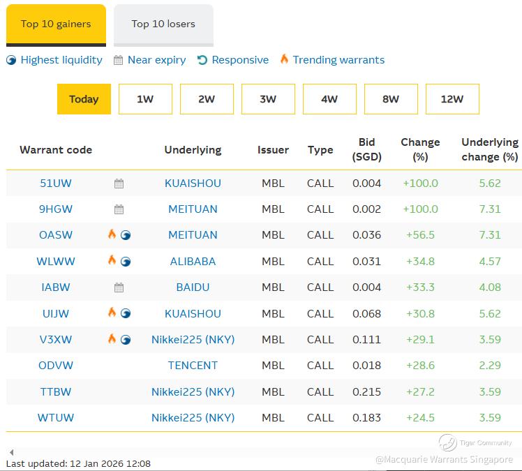 Macquarie's Nikkei225 call warrants $NKY 59000MBeCW260612(V3XW.SI)$ $NKY 50000MBeCW260313(TTBW.SI)$ $NKY 54000MBeCW260612(WTUW.SI)$ are amongst this morning's top warrant gainers with returns up to 29.1%, more than 7 times that of the Nikkei's 3.7% gain